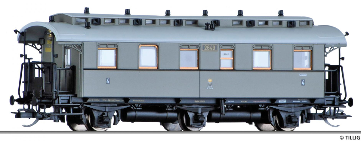 Kód   01726   ze SETu   [Osobní vozy] → [Spěšné a osobní] → [3-osé pruské] → 01726: osobní vůz šedý se světle šedou střechou 4. tř.