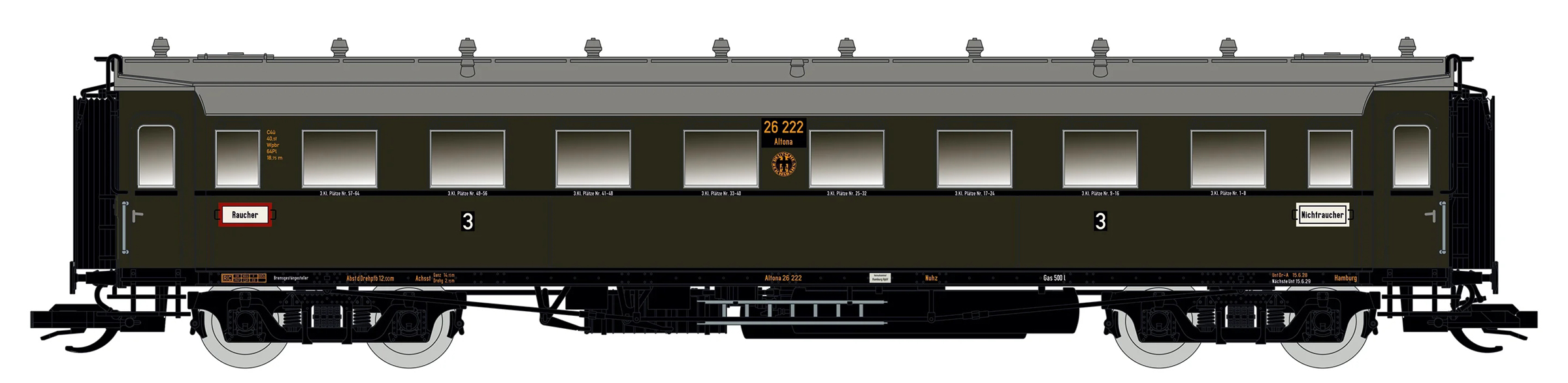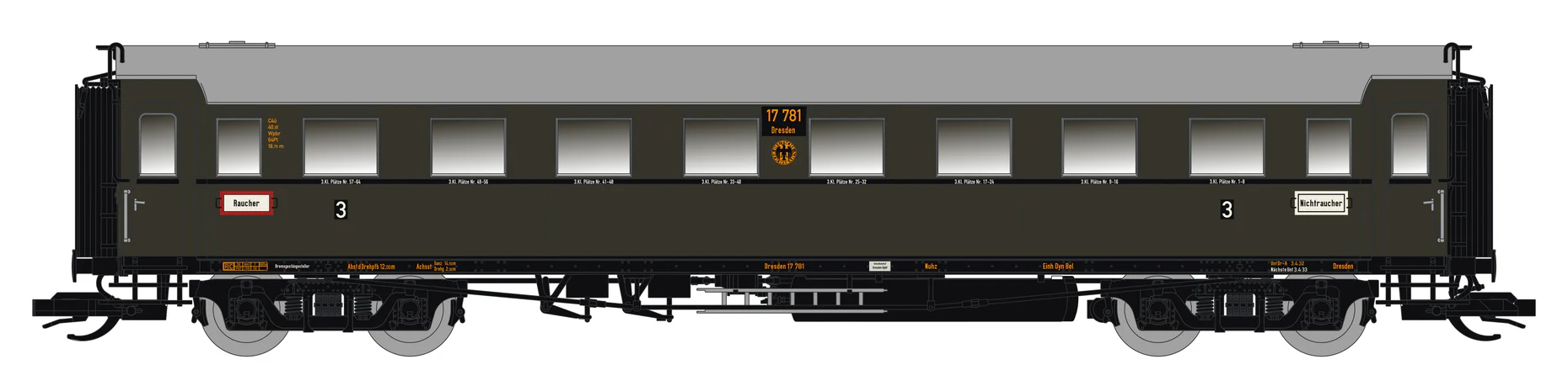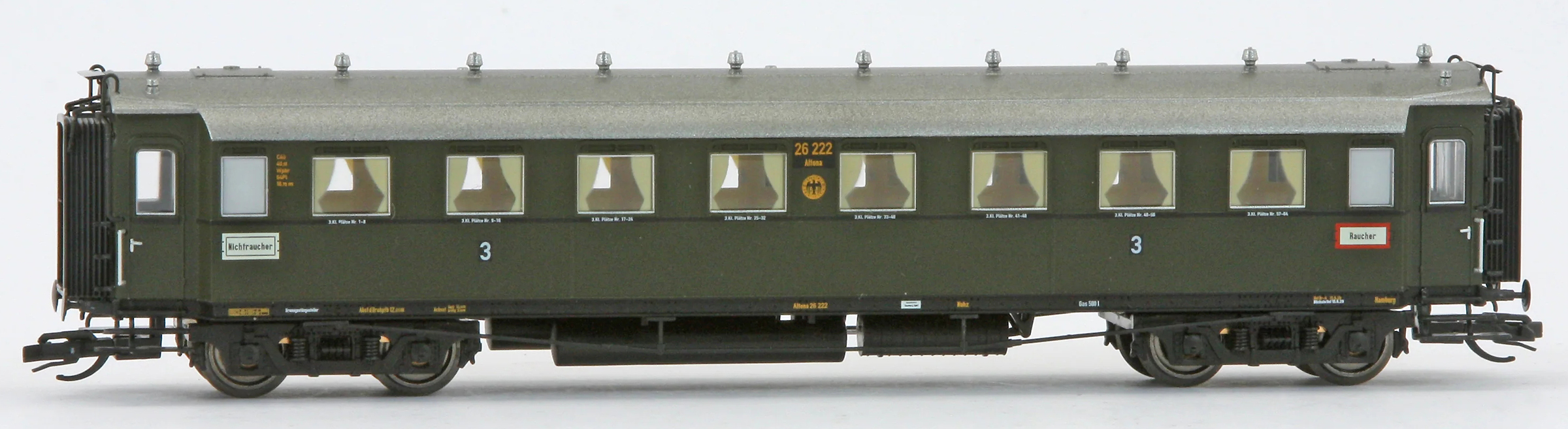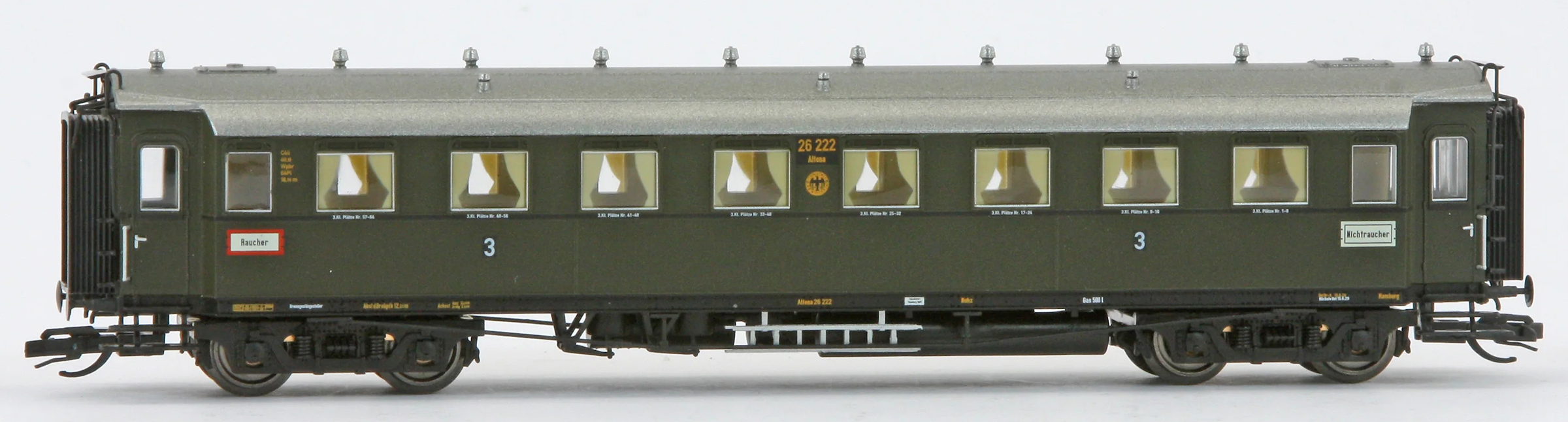 | oddílový osobní vůz tmavě zelený s šedou střechou 3. tř. |