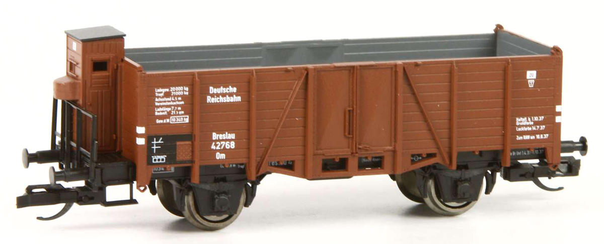 | otevřený nákladní vůz červenohnědý s brzdařskou budkou |