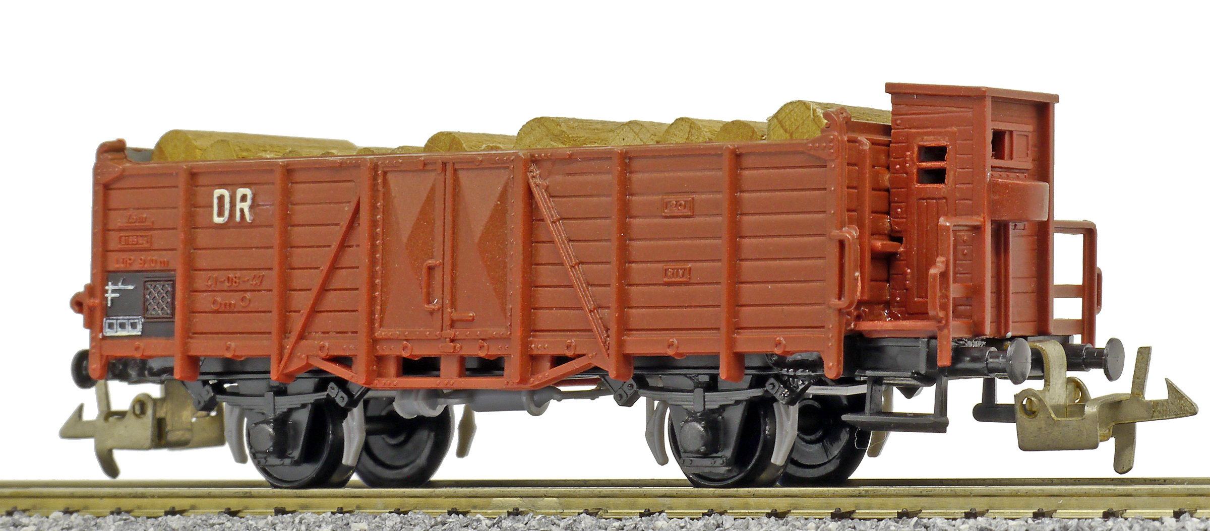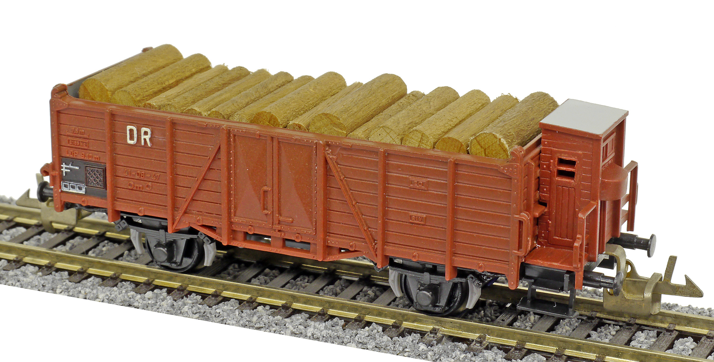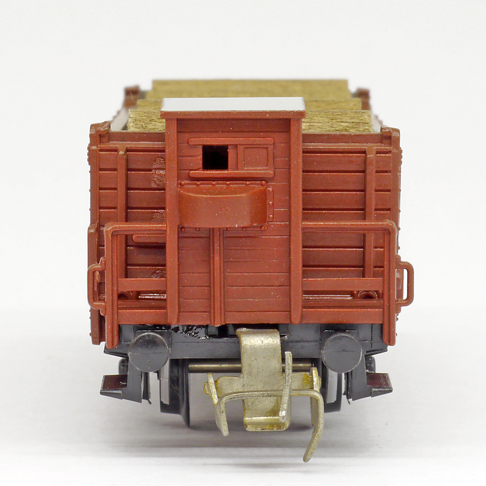| otevřený nákladní vůz červenohnědý s brzdařskou budkou ložený kulatinou |