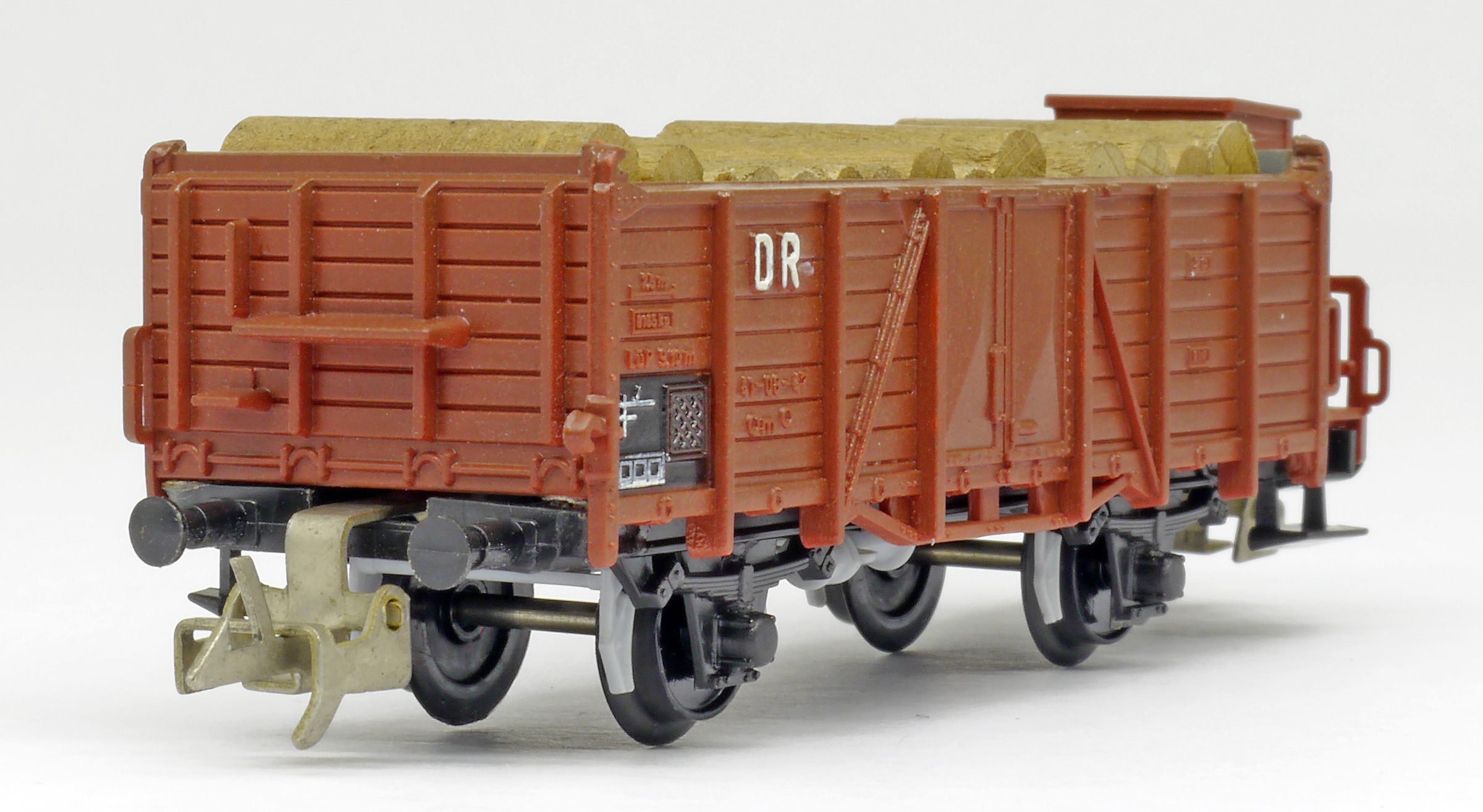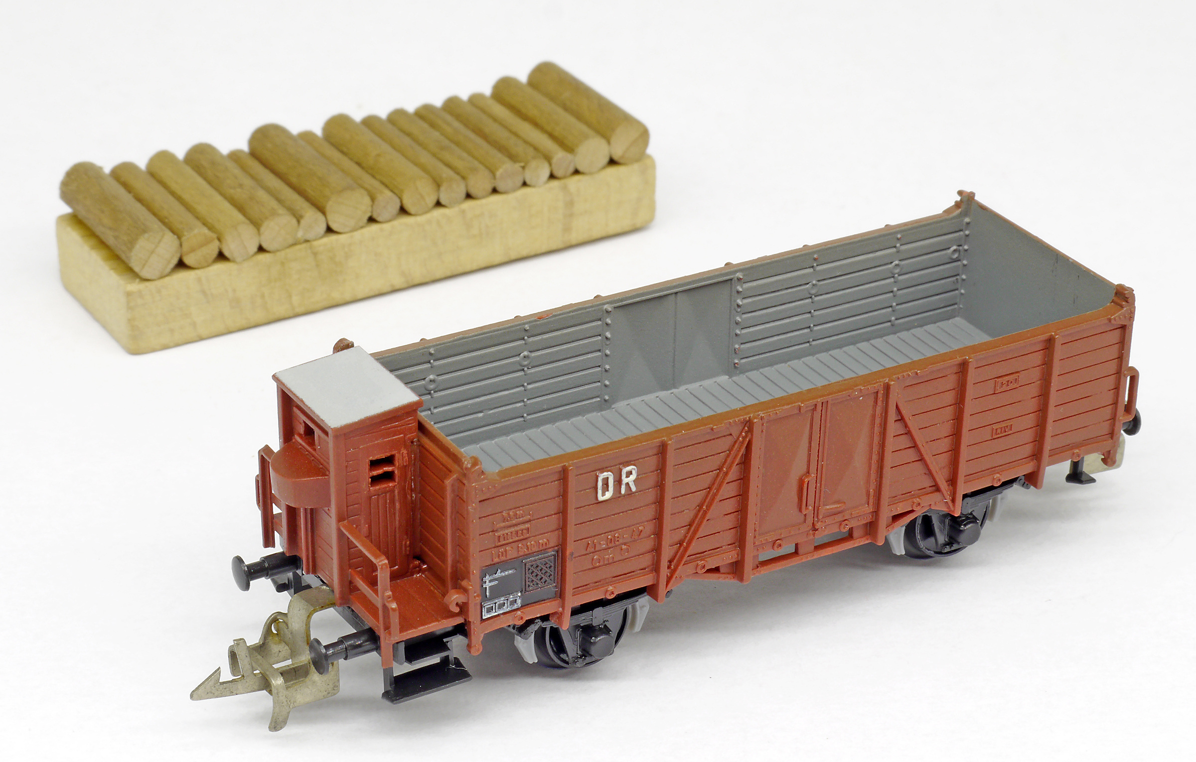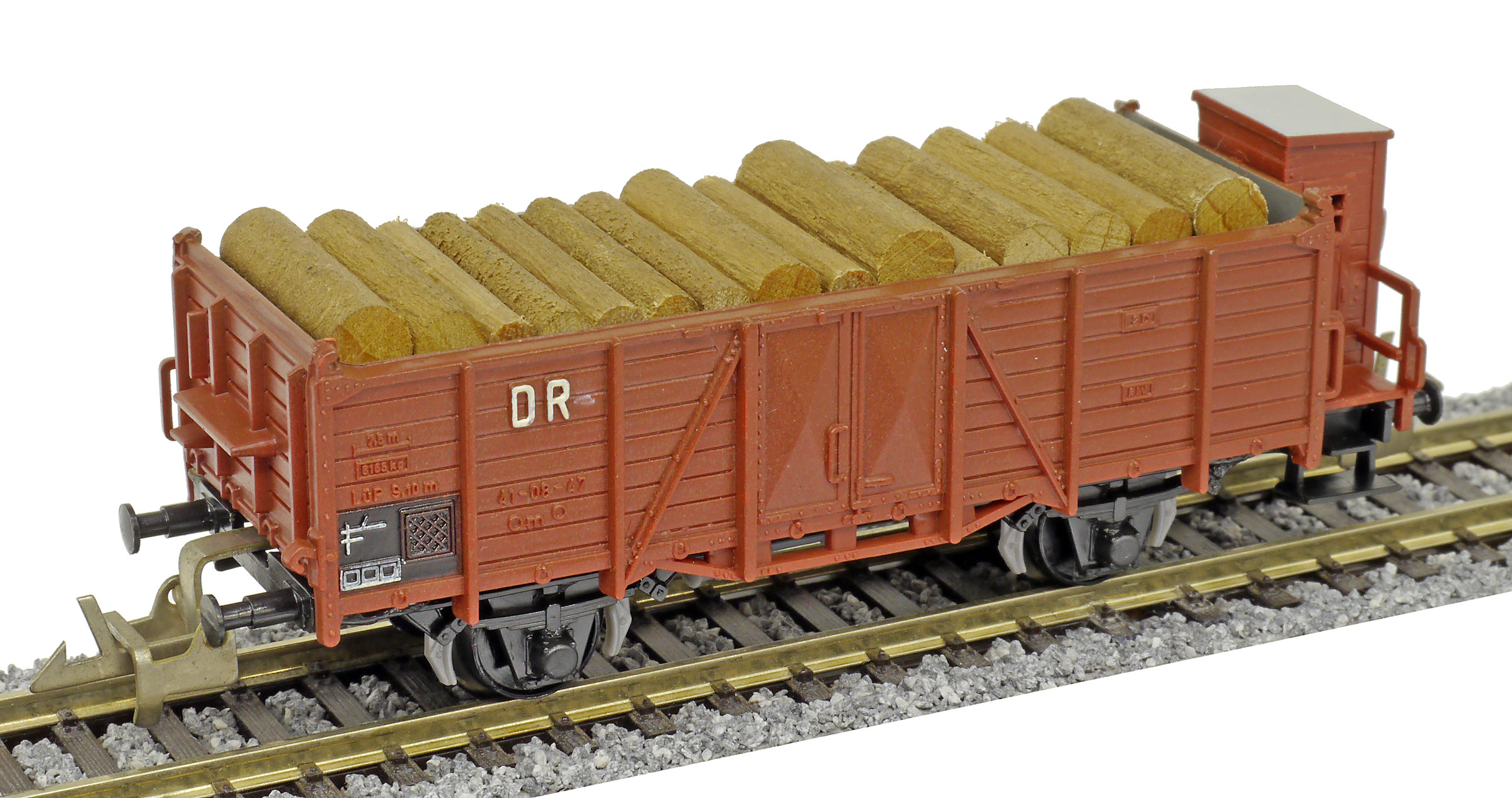 | otevřený nákladní vůz červenohnědý s brzdařskou budkou ložený kulatinou |