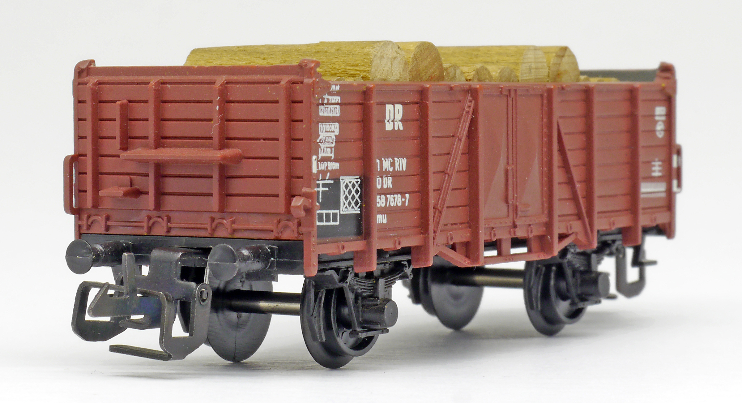 | otevřený nákladní vůz červenohnědý s nákladem kulatiny |