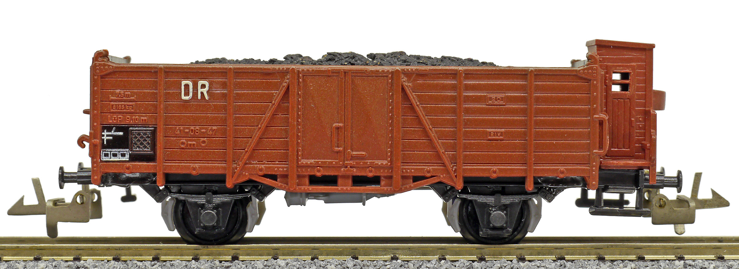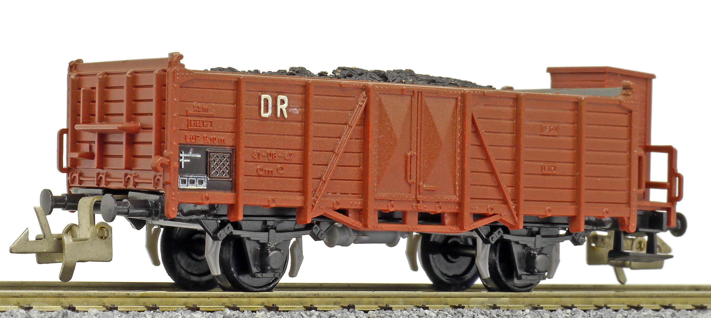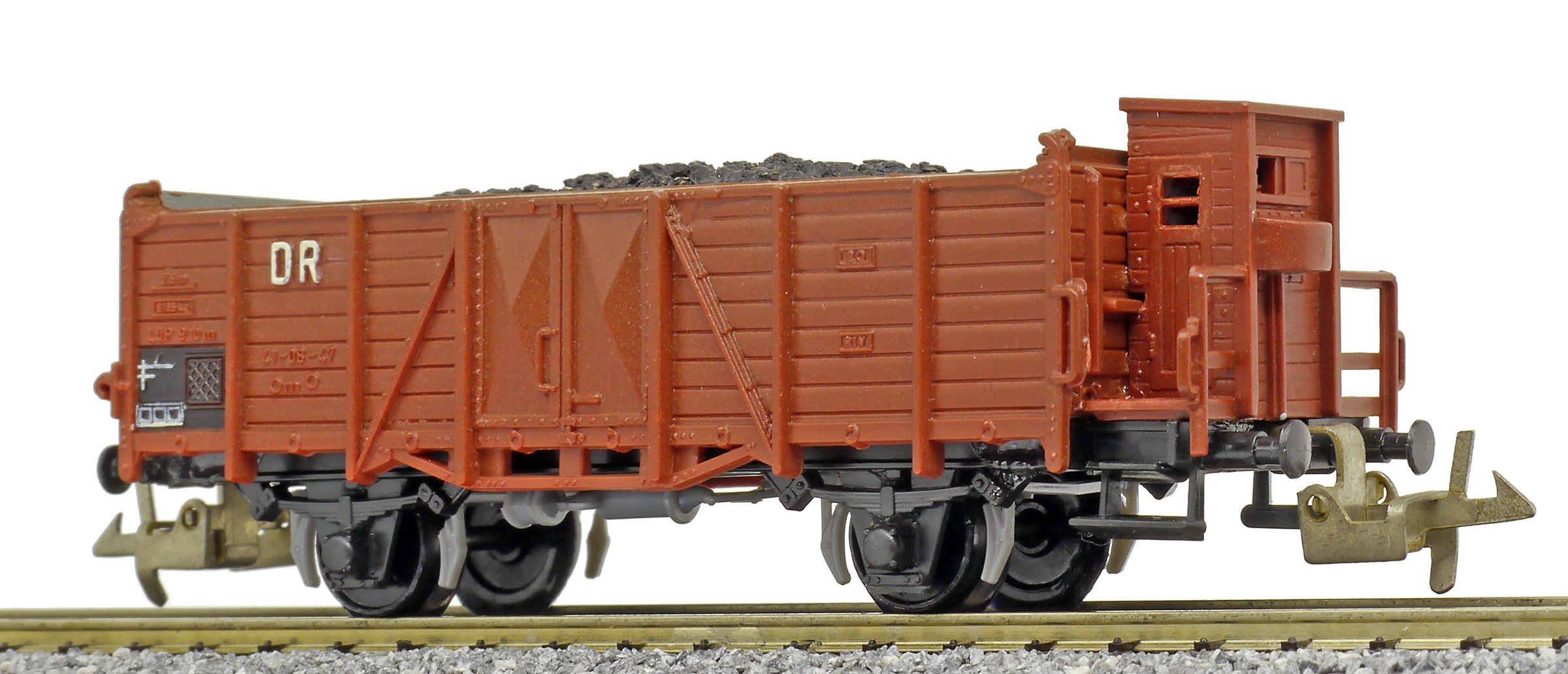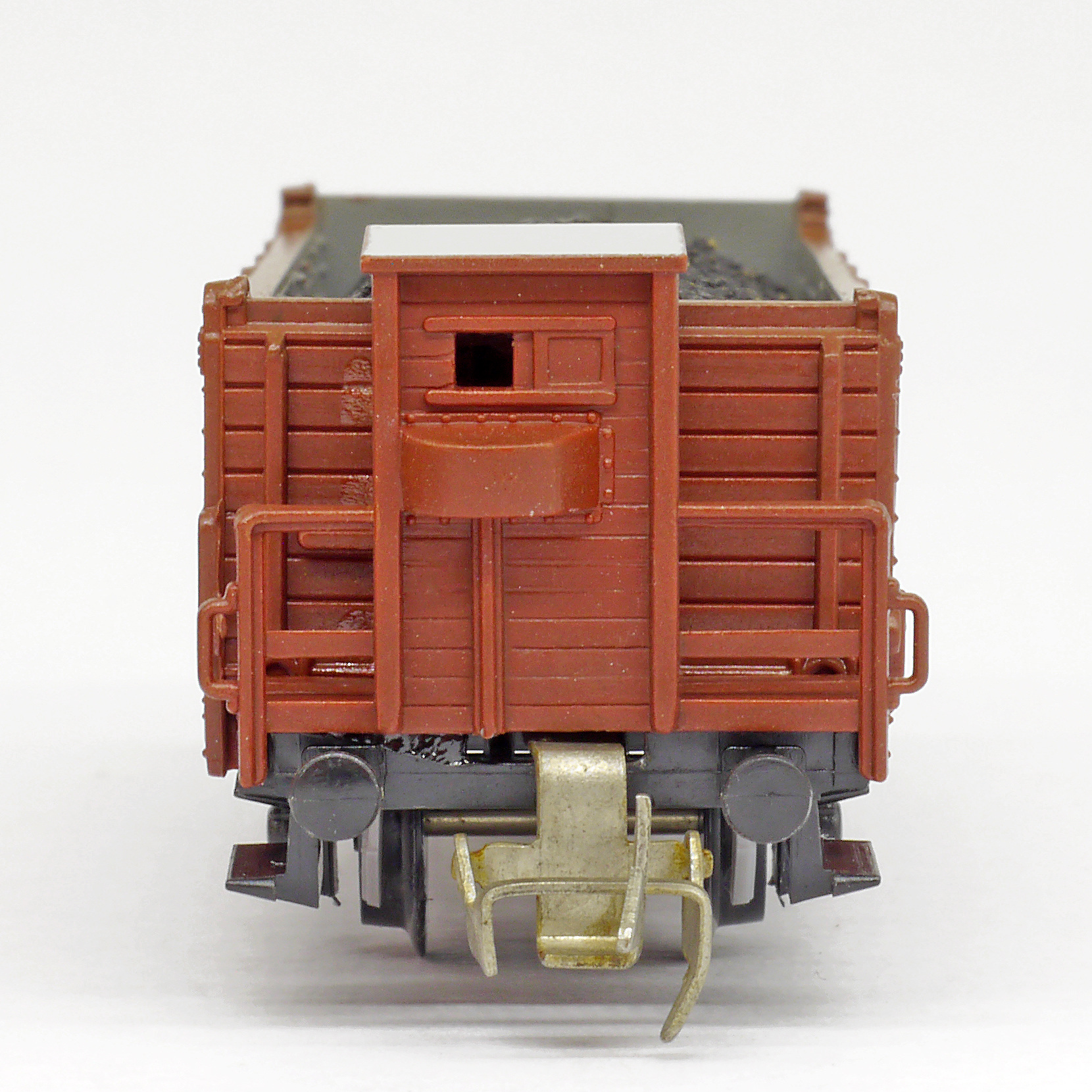 otevřený nákladní vůz červenohnědý s brzdařskou budkou ložený uhlím