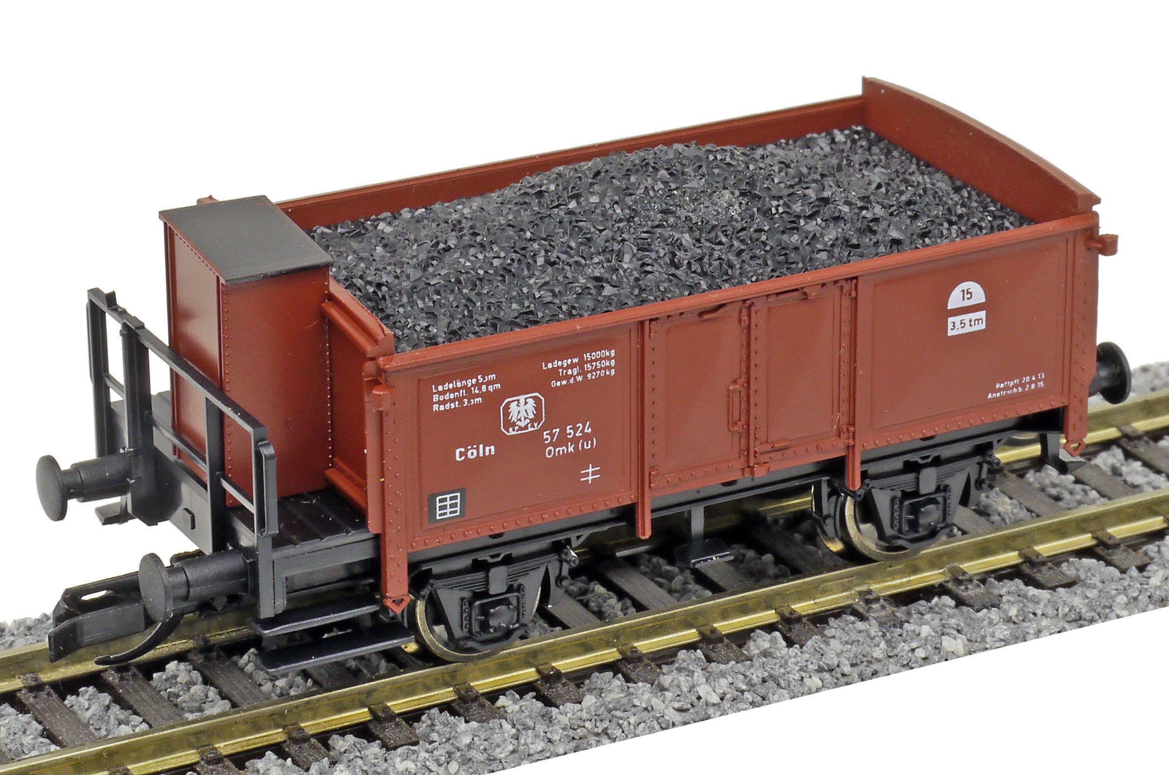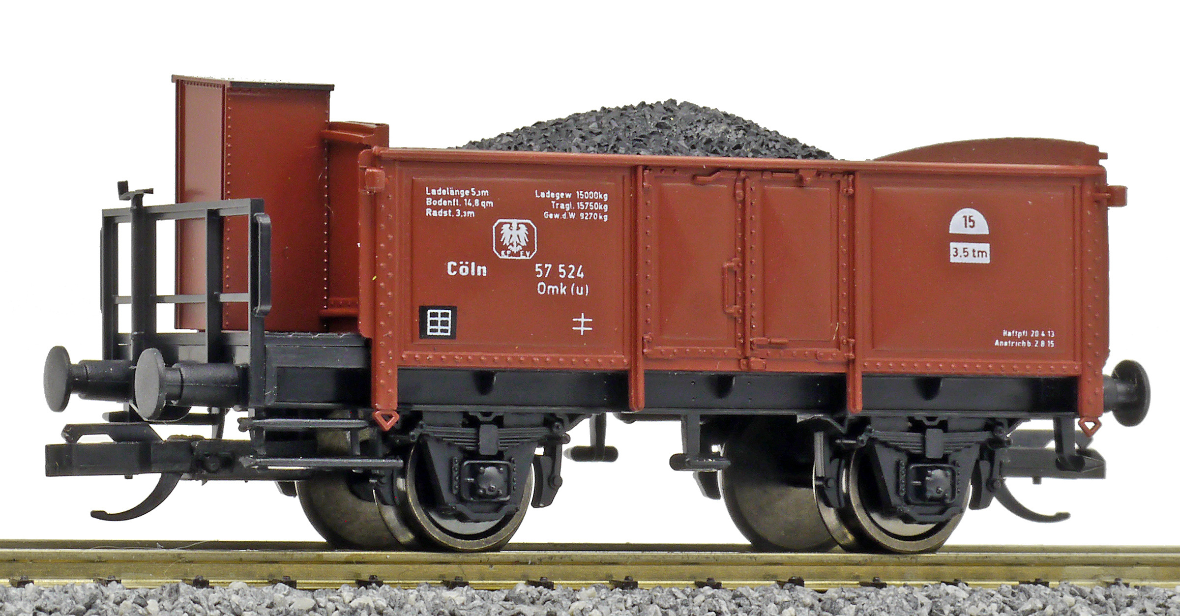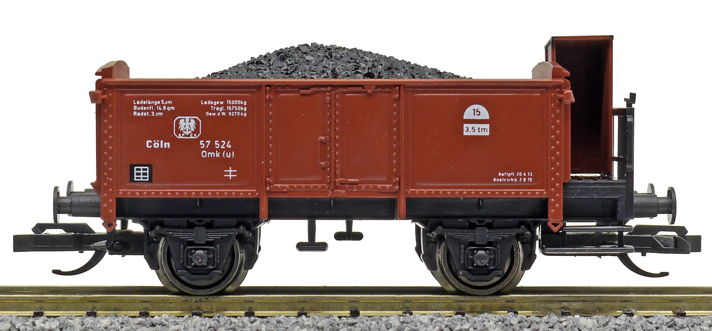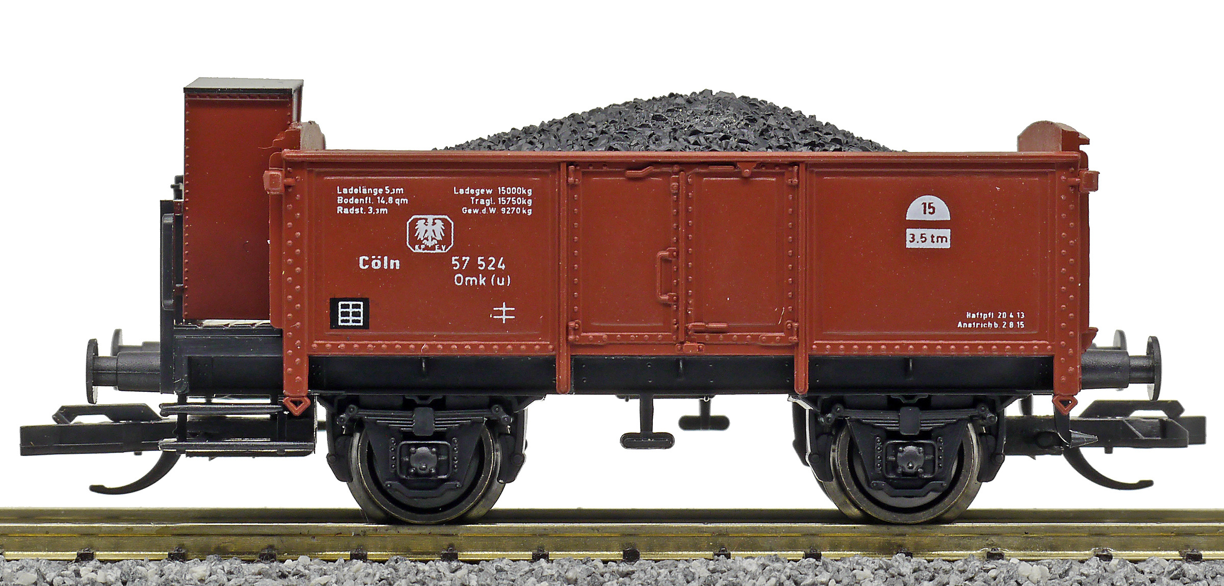 | otevřený nákladní vůz červenohnědý s brzdařskou budkou ložený uhlím |