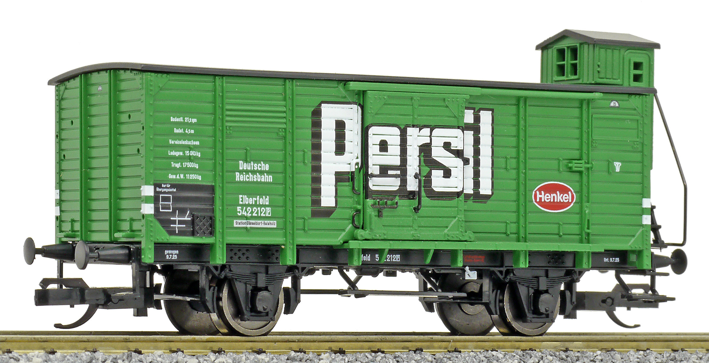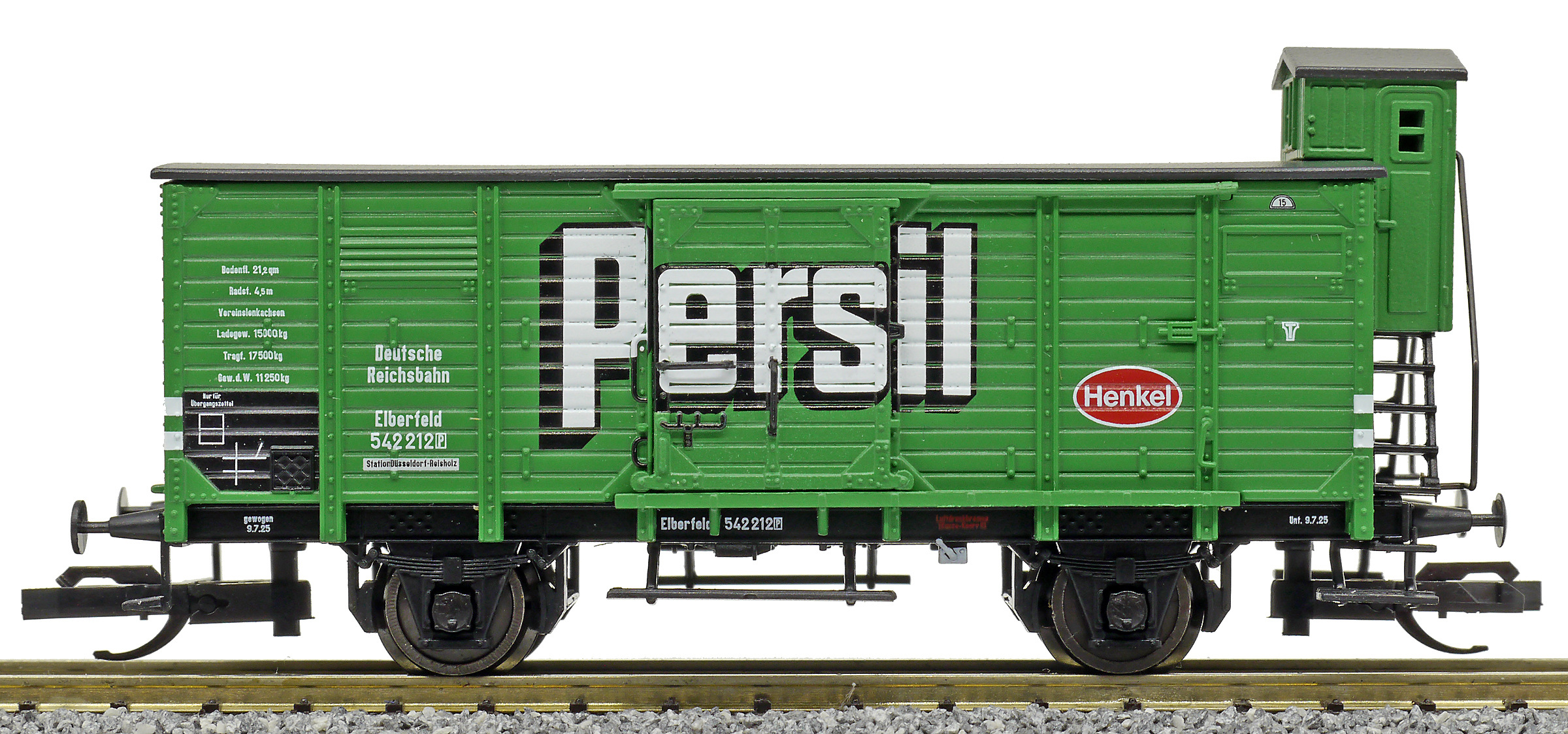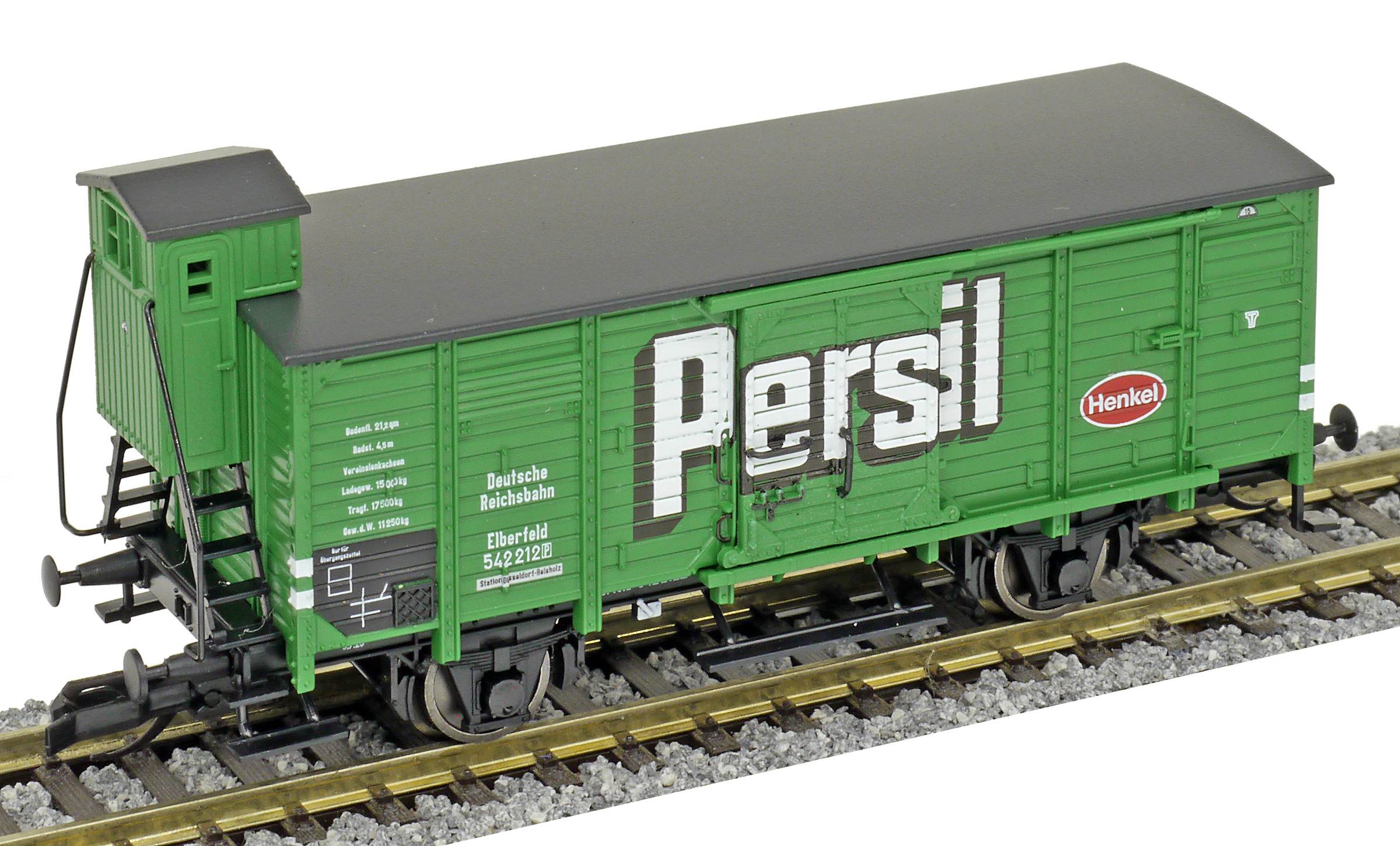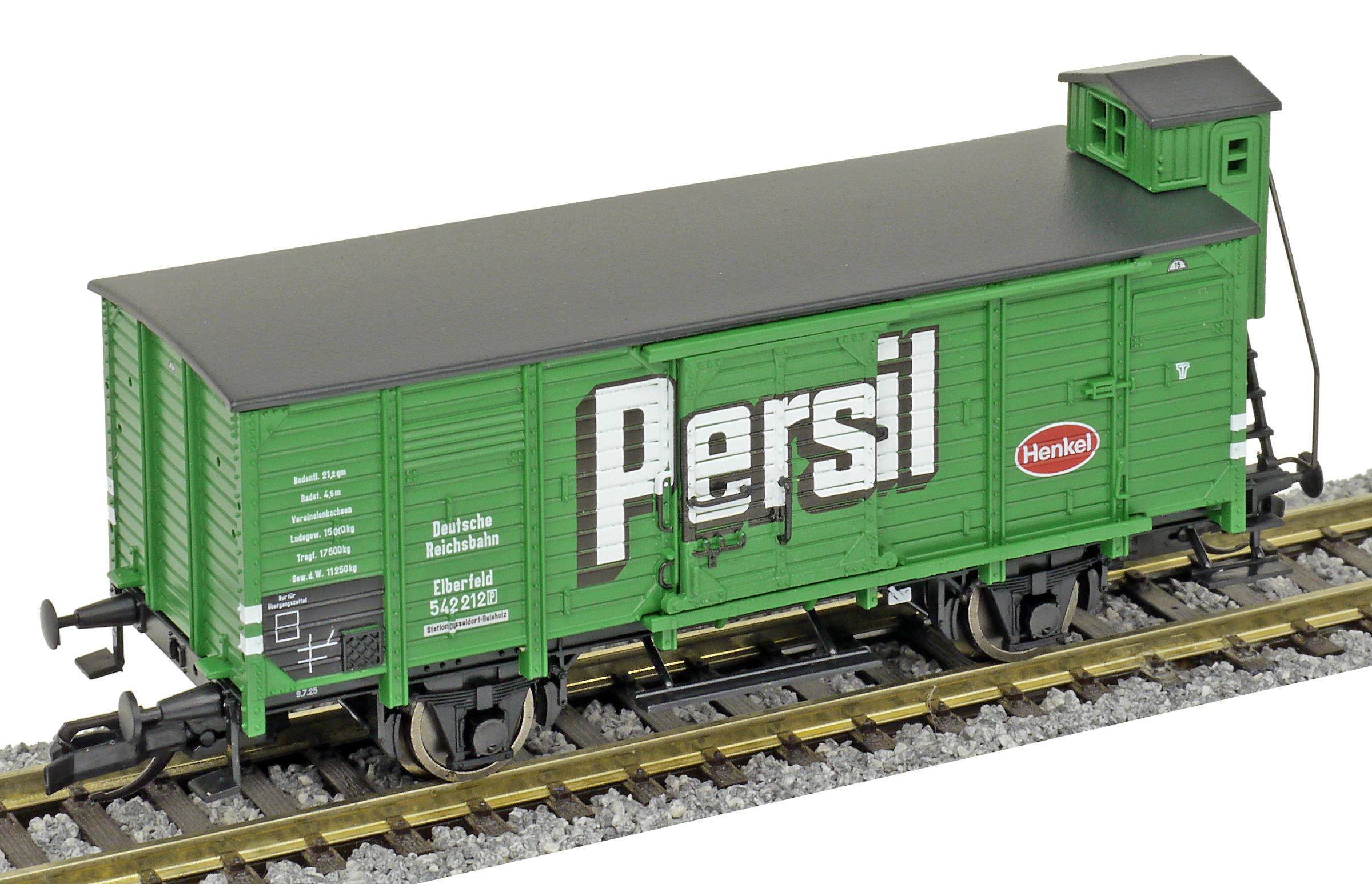 | krytý nákladní vůz zelený s černou střechou a s brzdařskou budkou „Persil“ |