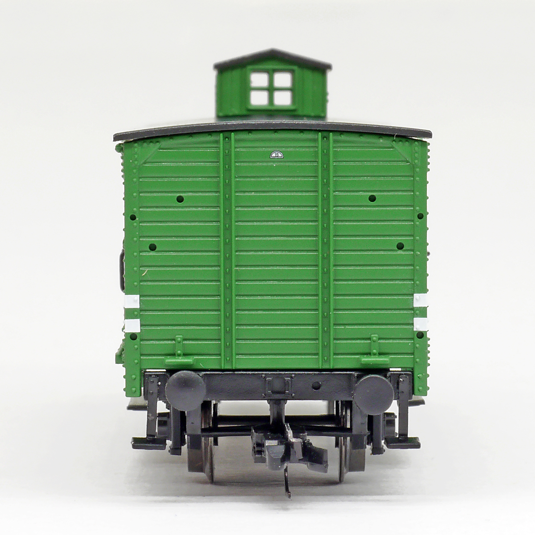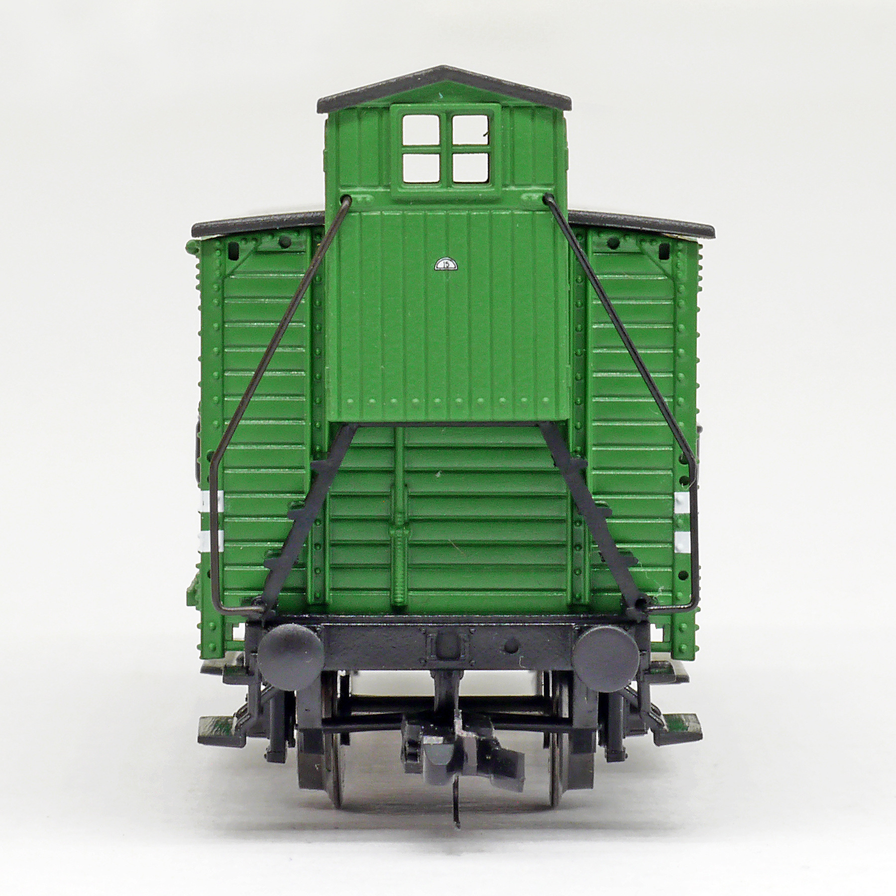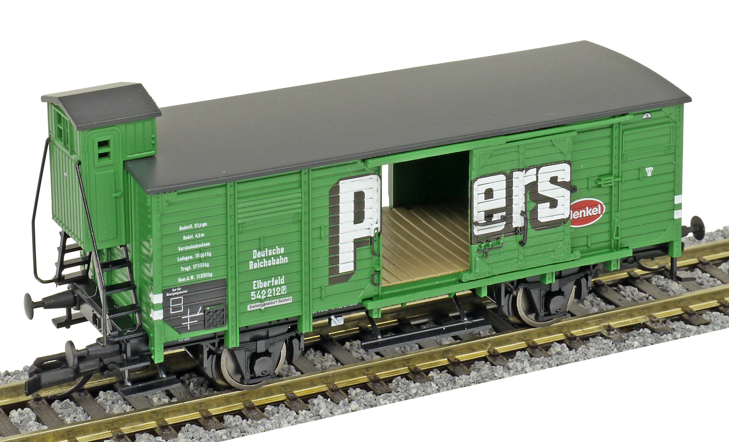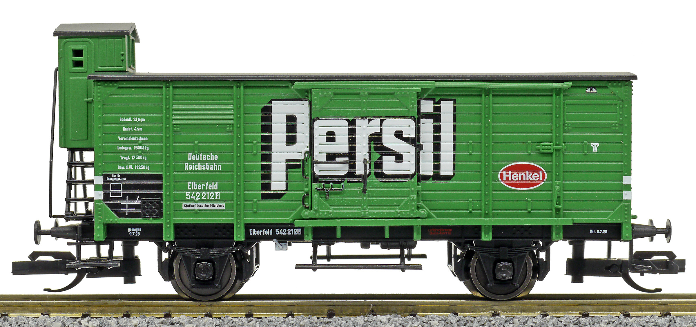 | krytý nákladní vůz zelený s černou střechou a s brzdařskou budkou „Persil“ |