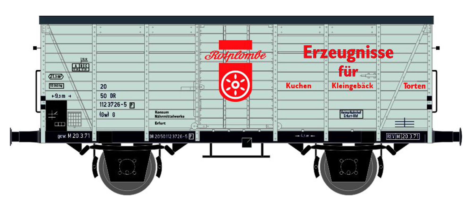 | krytý nákladní vůz světle tyrkysový s černou střechou „VEB Konsum Nährmittelwerk Erfurt Rotplombe“ |