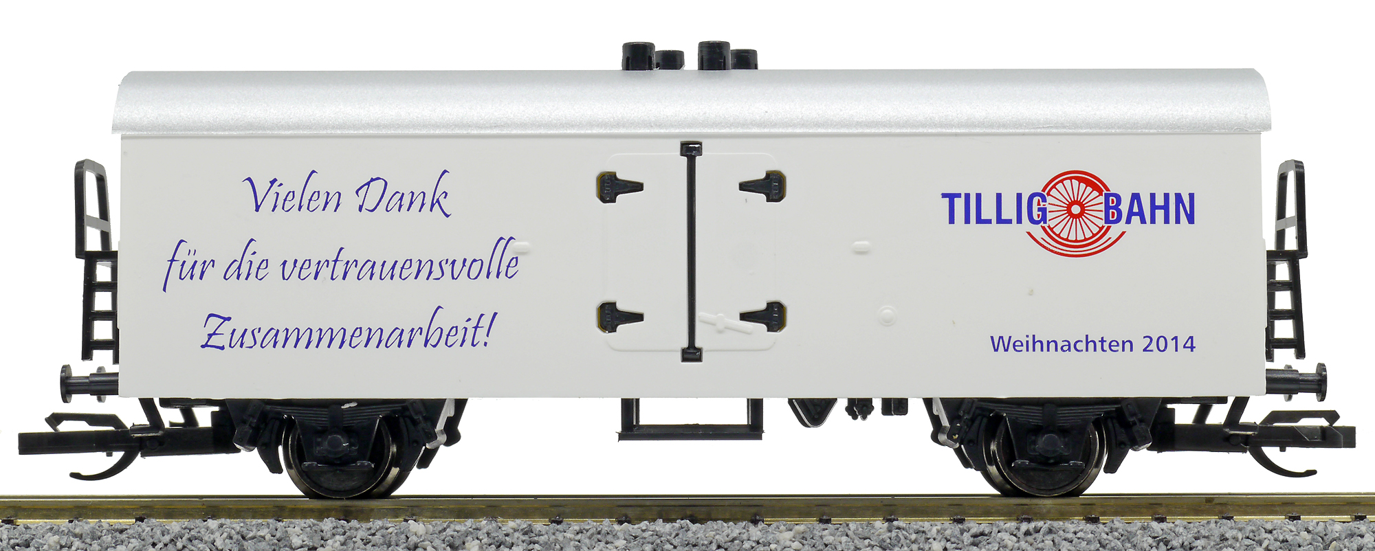 Kód   500940  [Nákladní vozy] → [Kryté] → [2-osé chladicí, pivní a reklamní] → 500940: bílý se stříbrnou střechou, vánoční Tillig 2009