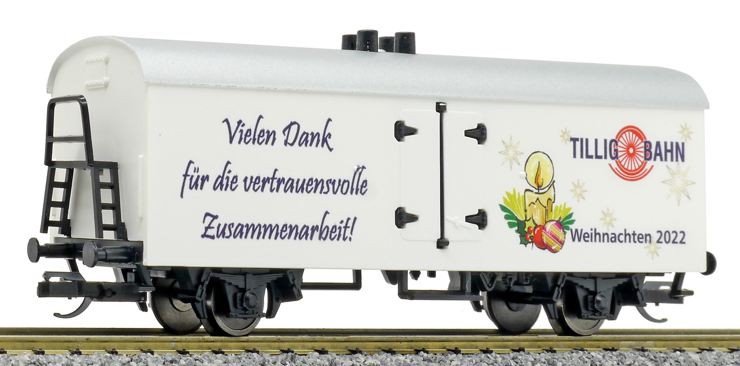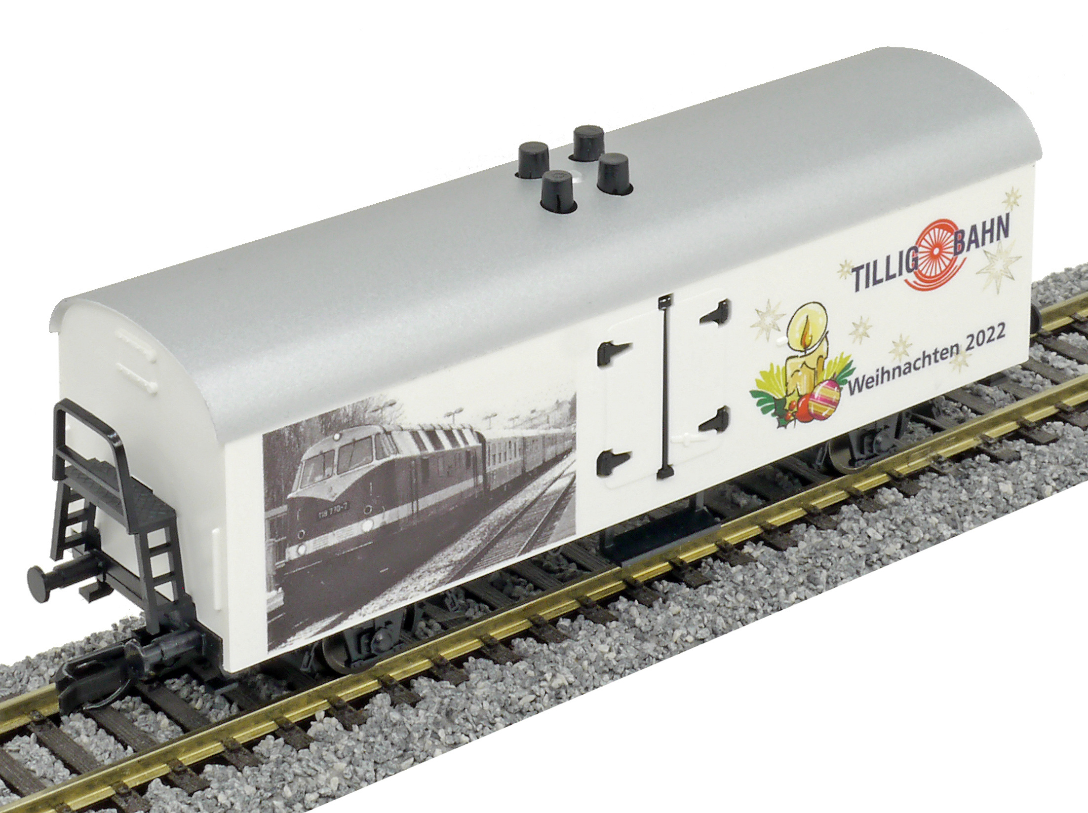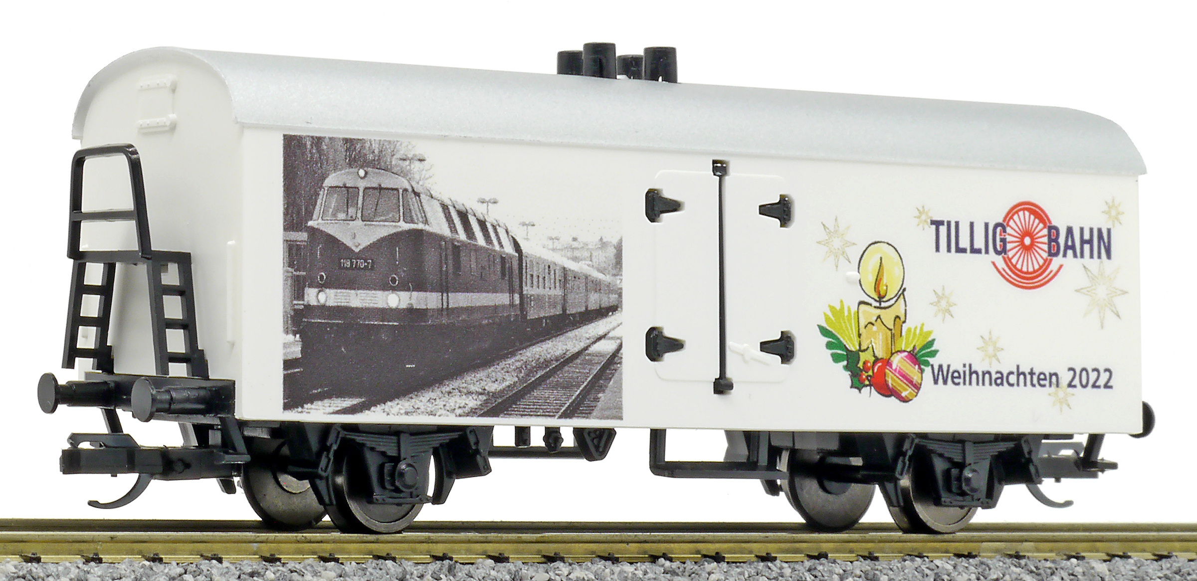 Kód   500940  [Nákladní vozy] → [Kryté] → [2-osé chladicí, pivní a reklamní] → 500940: bílý se stříbrnou střechou, vánoční Tillig 2009