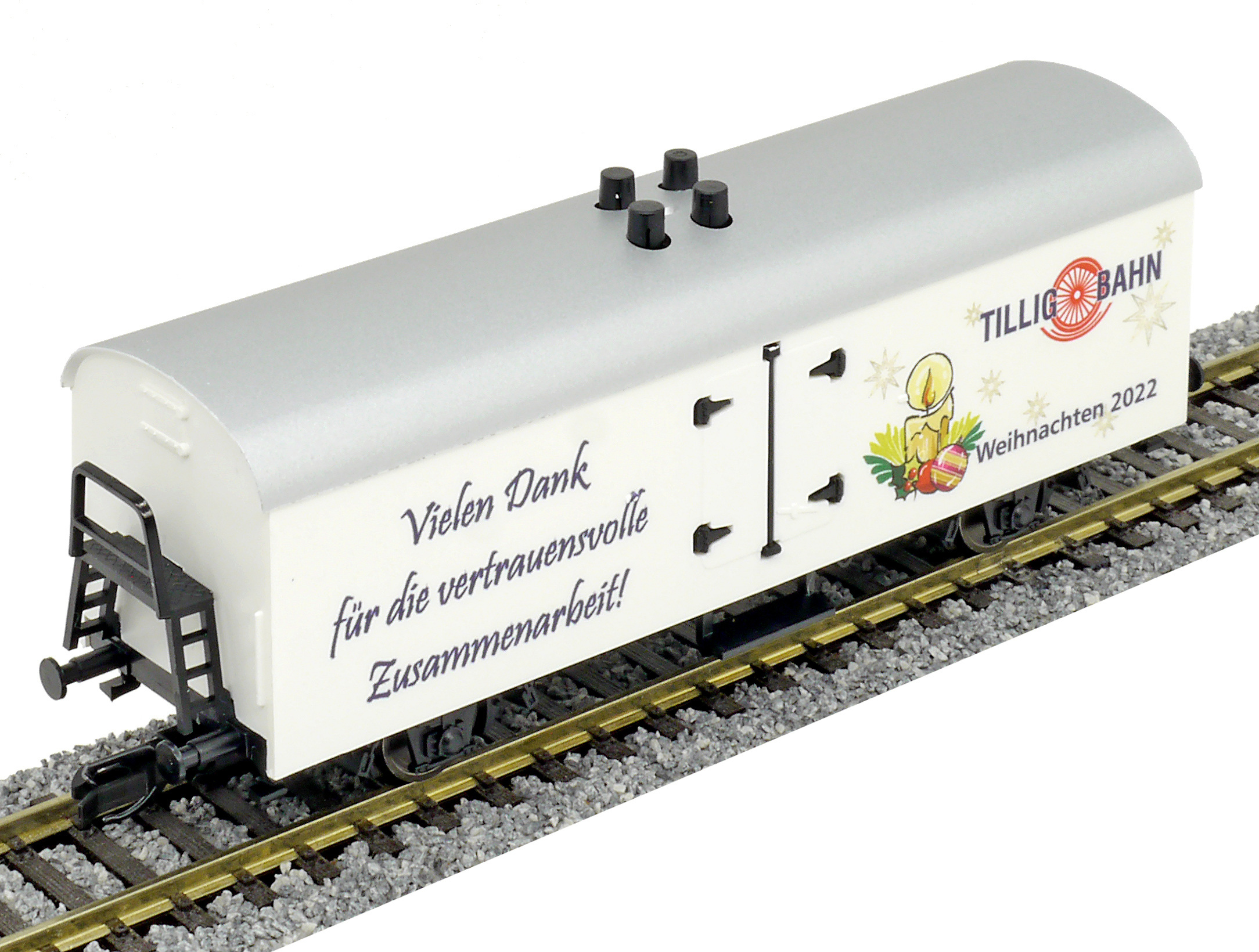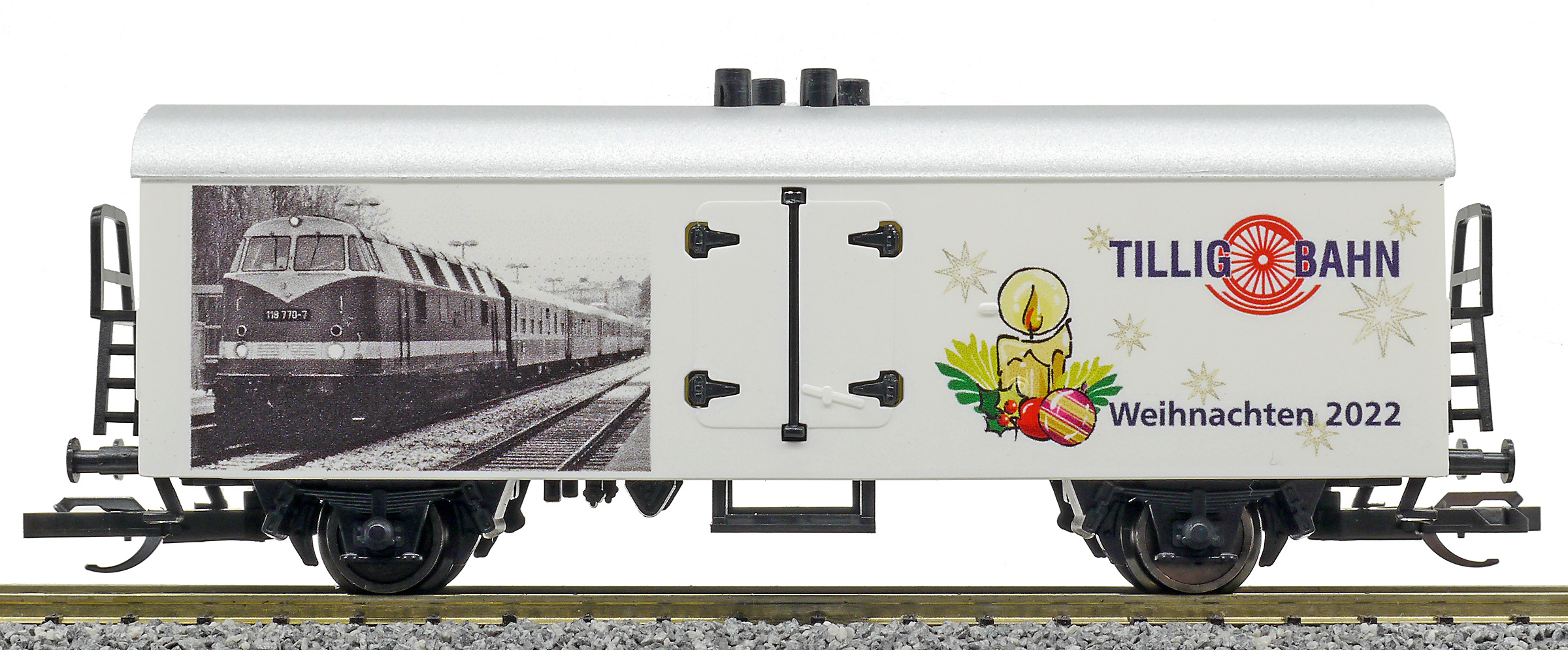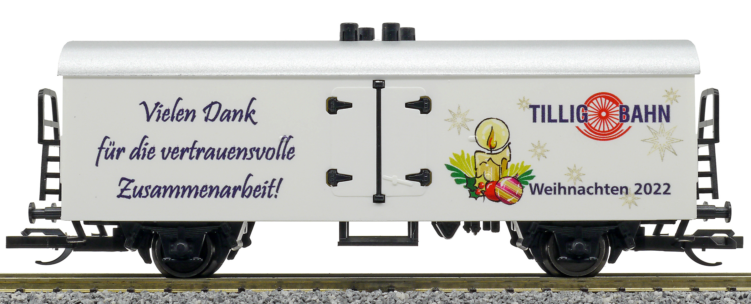 Kód   500940  [Nákladní vozy] → [Kryté] → [2-osé chladicí, pivní a reklamní] → 500940: bílý se stříbrnou střechou, vánoční Tillig 2009