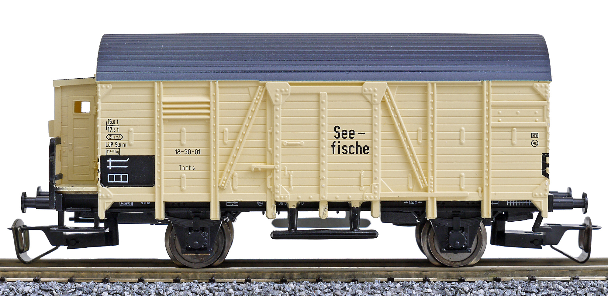 krytý nákladní vůz krémový s černou střechou a s brzdařskou budkou „Seefische“
