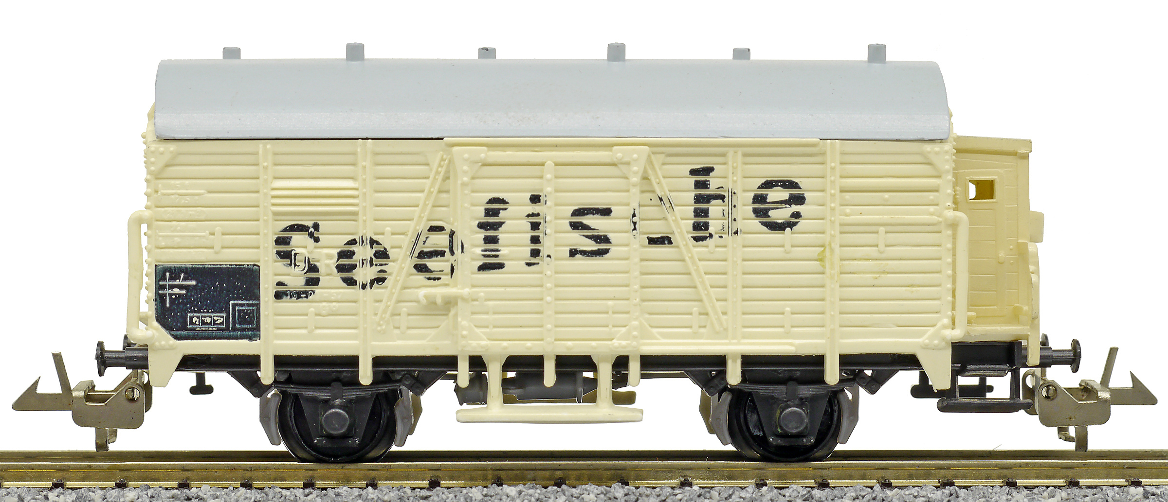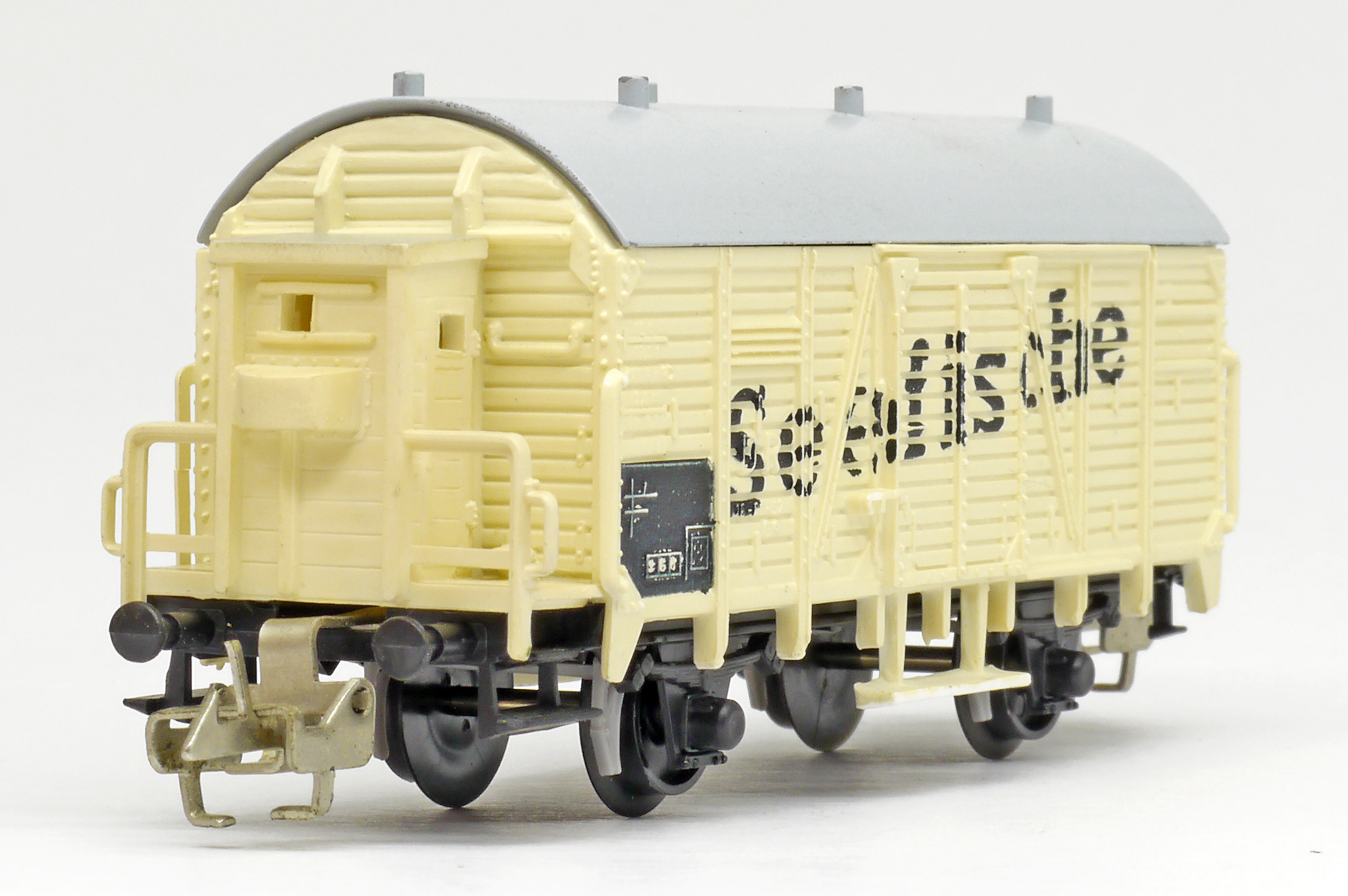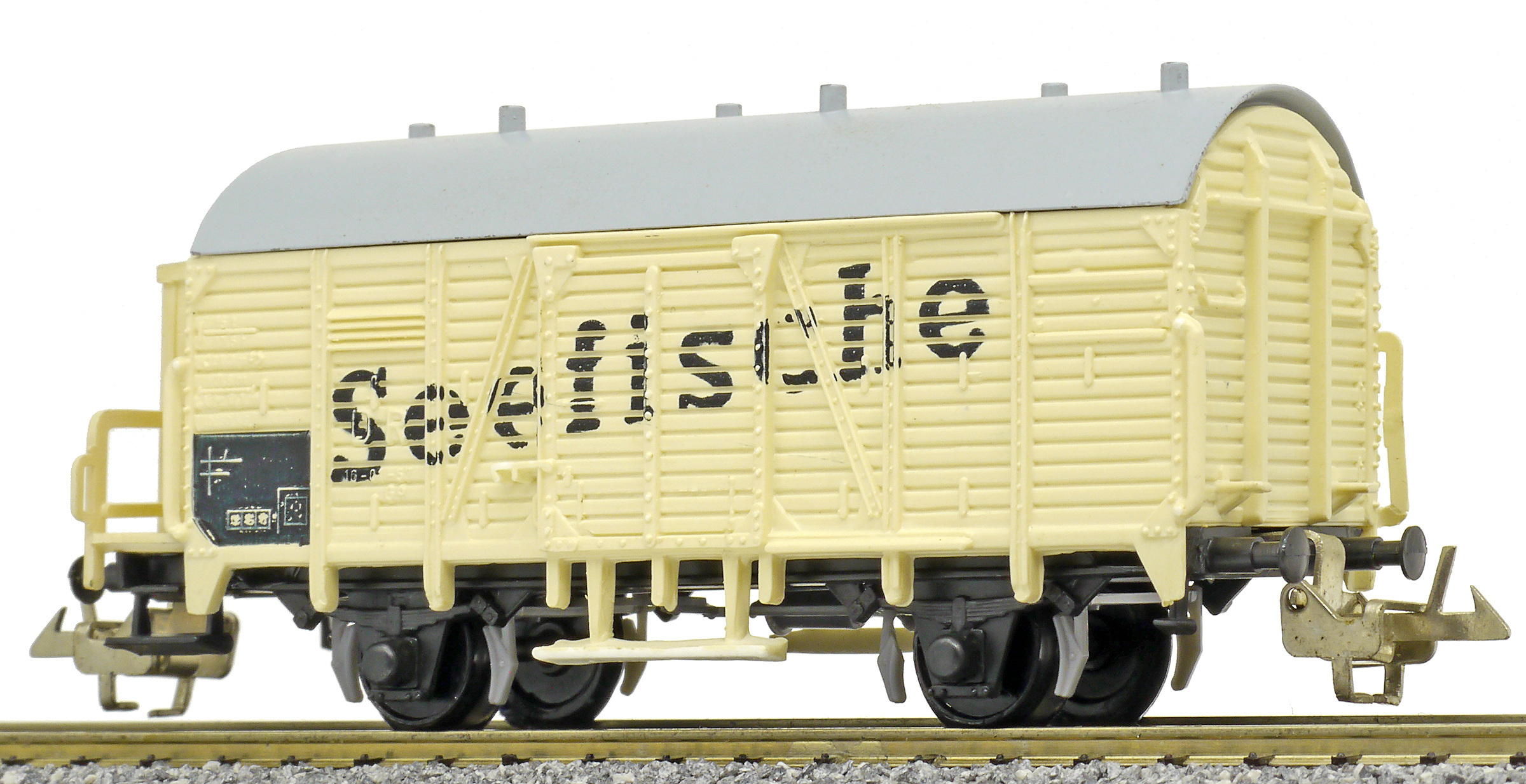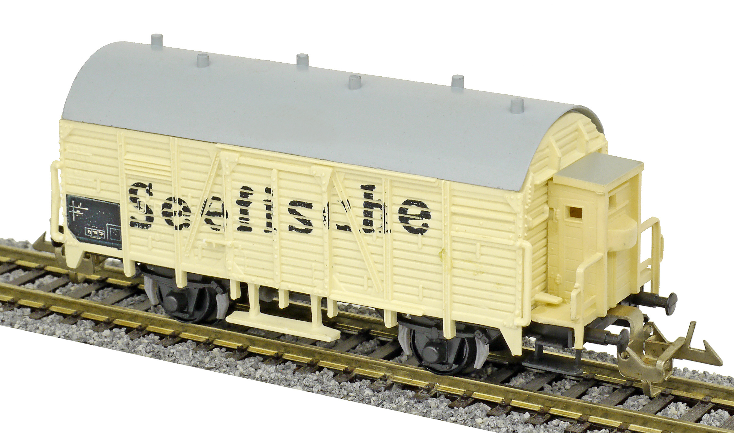 | nákladní chladící vůz krémový s šedou střechou a brzdařskou budkou „Seefische“ |