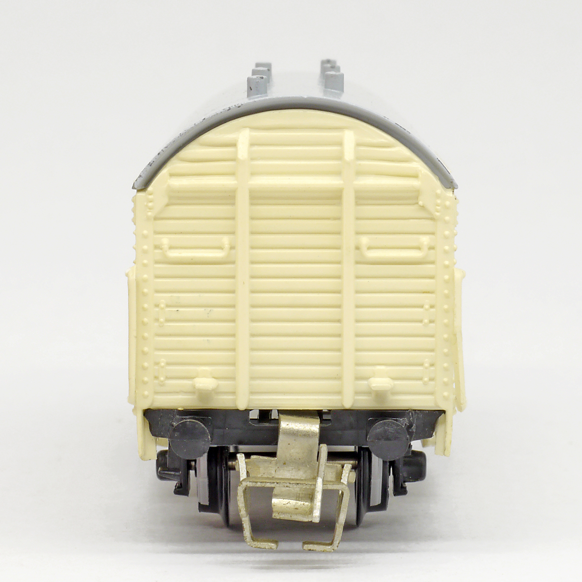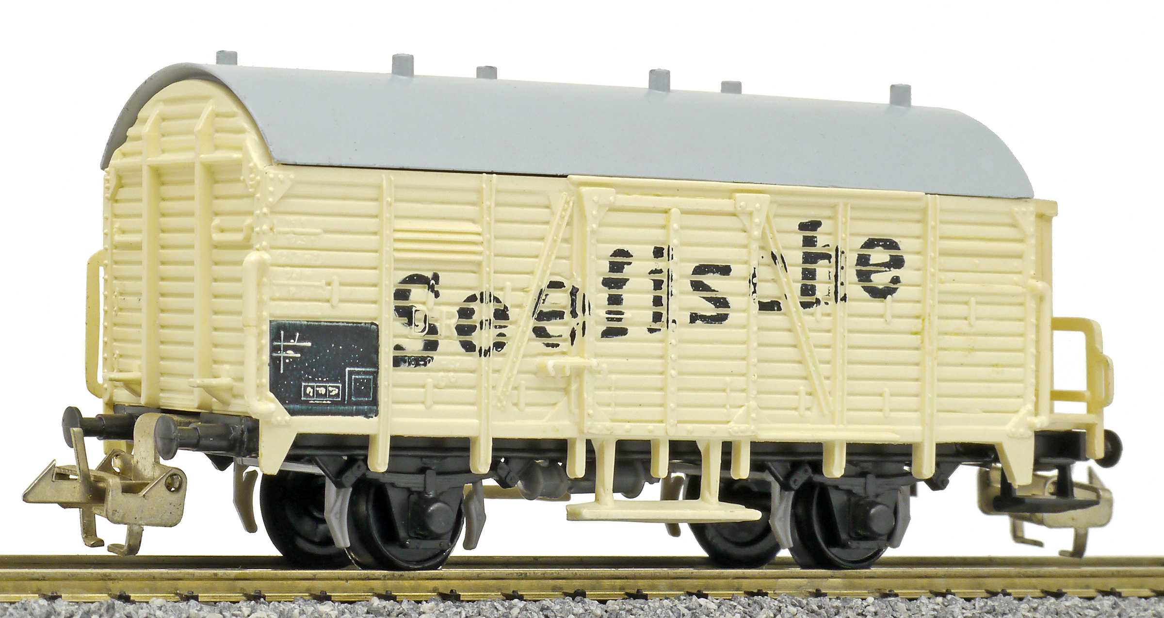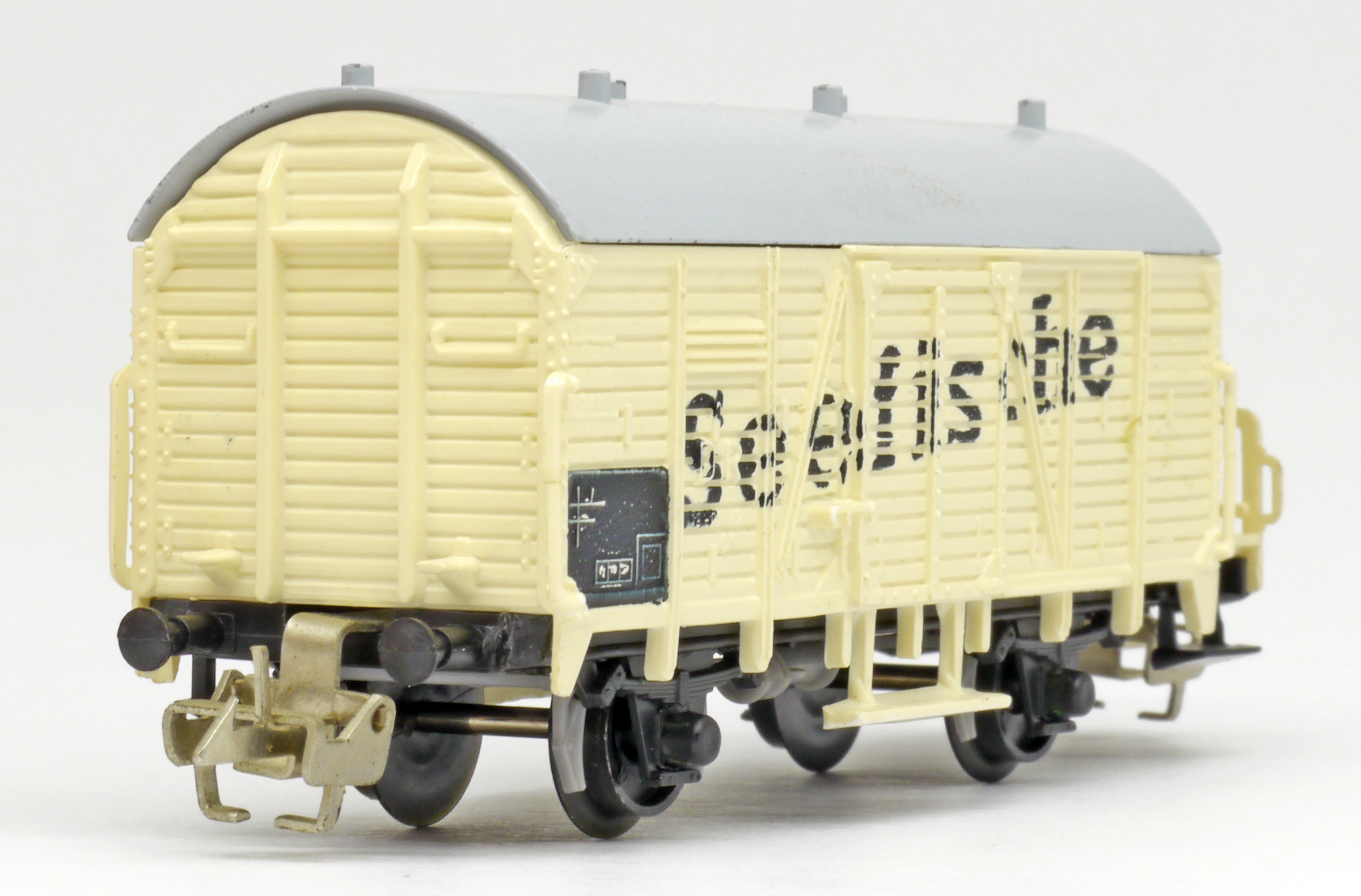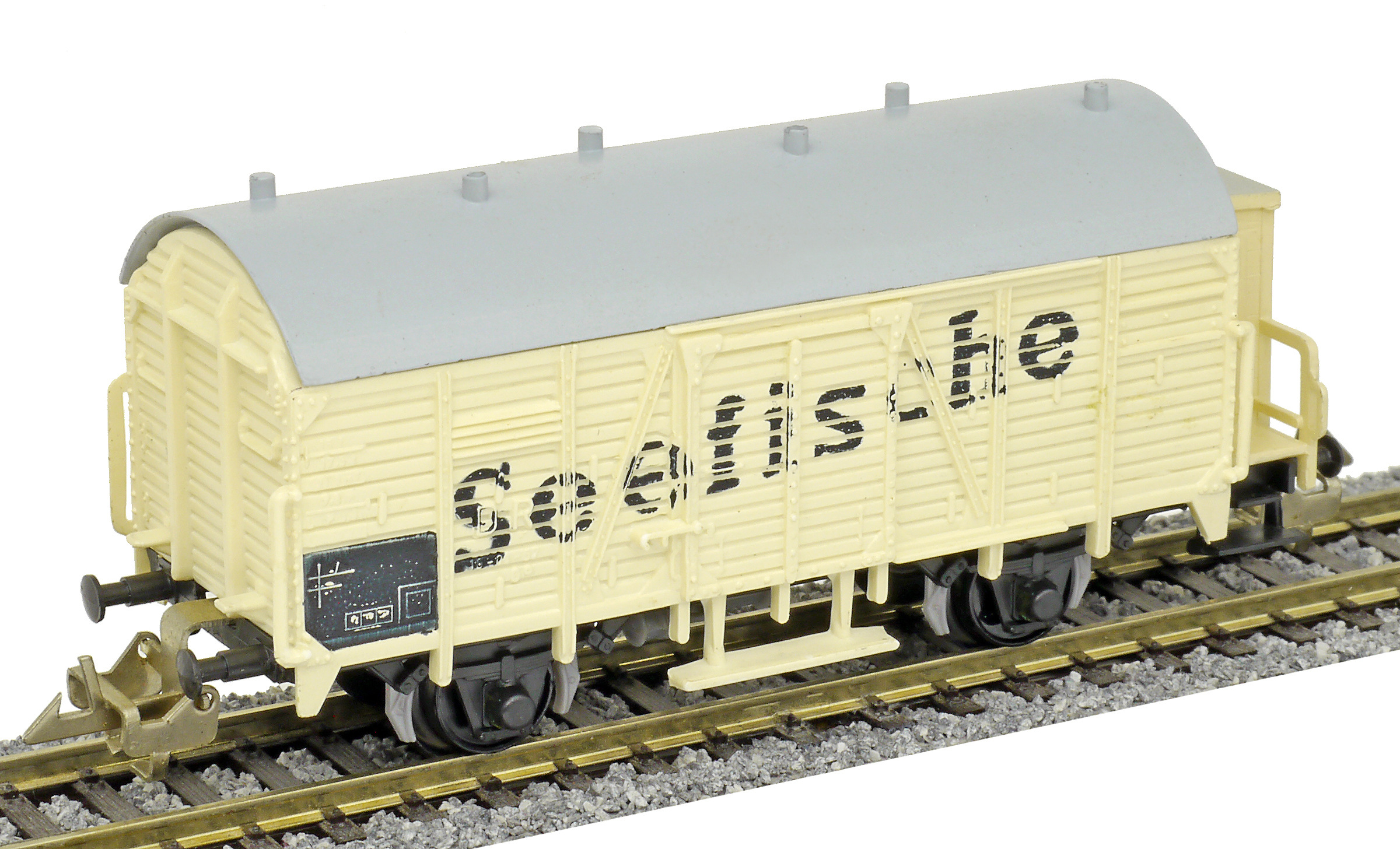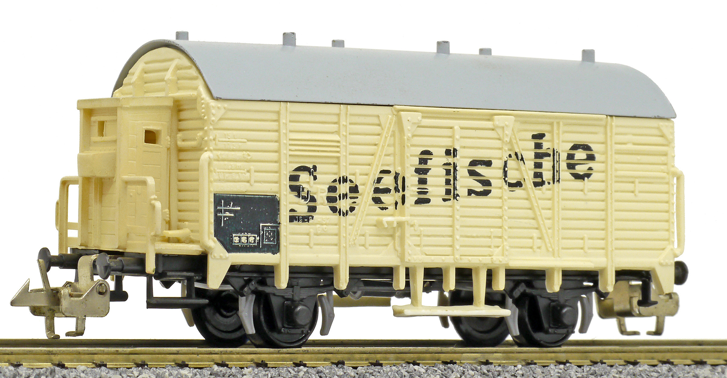 | nákladní chladící vůz krémový s šedou střechou a brzdařskou budkou „Seefische“ |