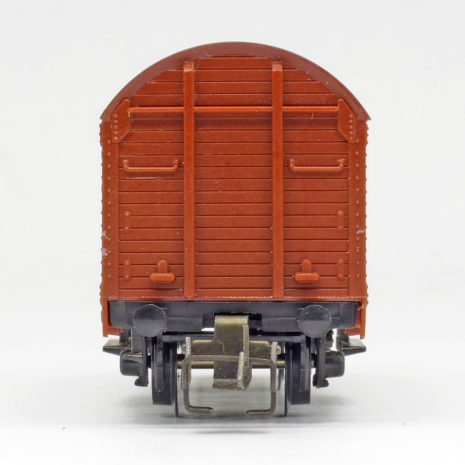 | krytý nákladní vůz červenohnědý s černou střechou a s brzdařskou budkou |
