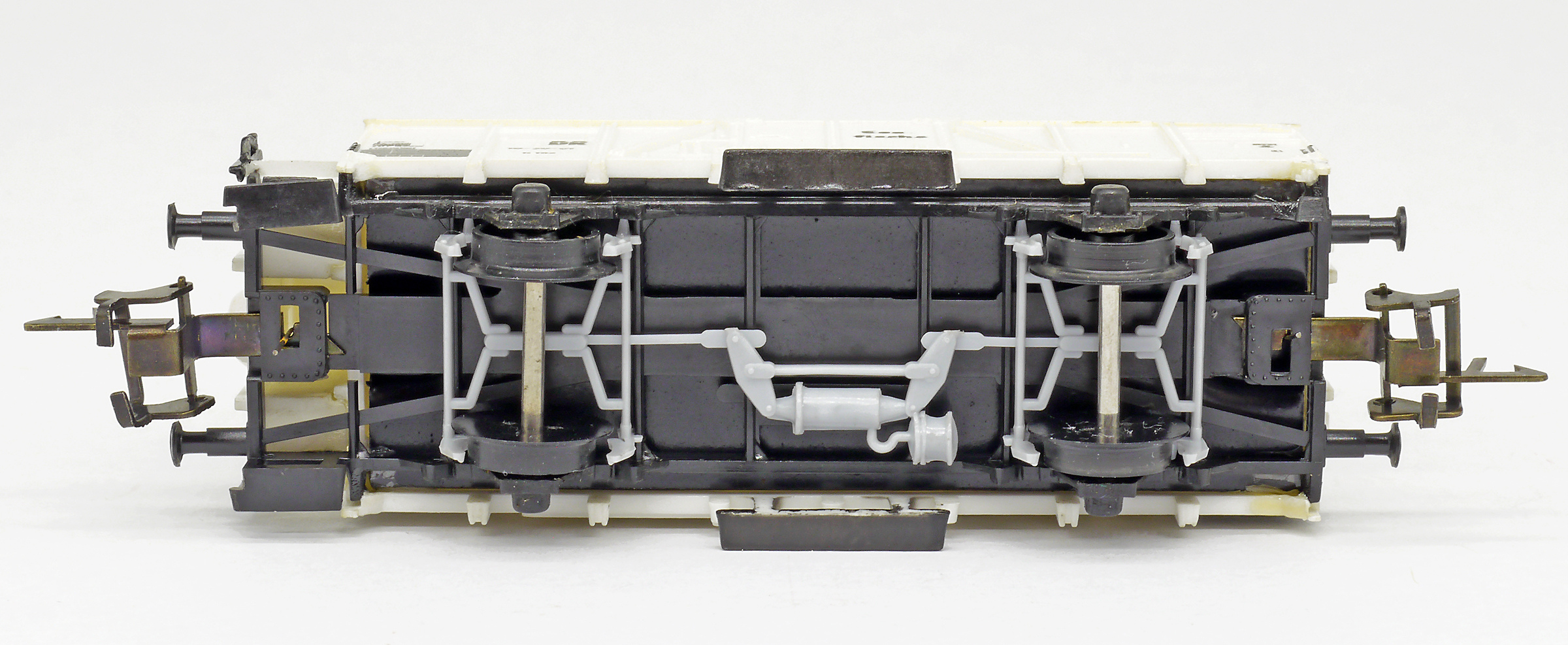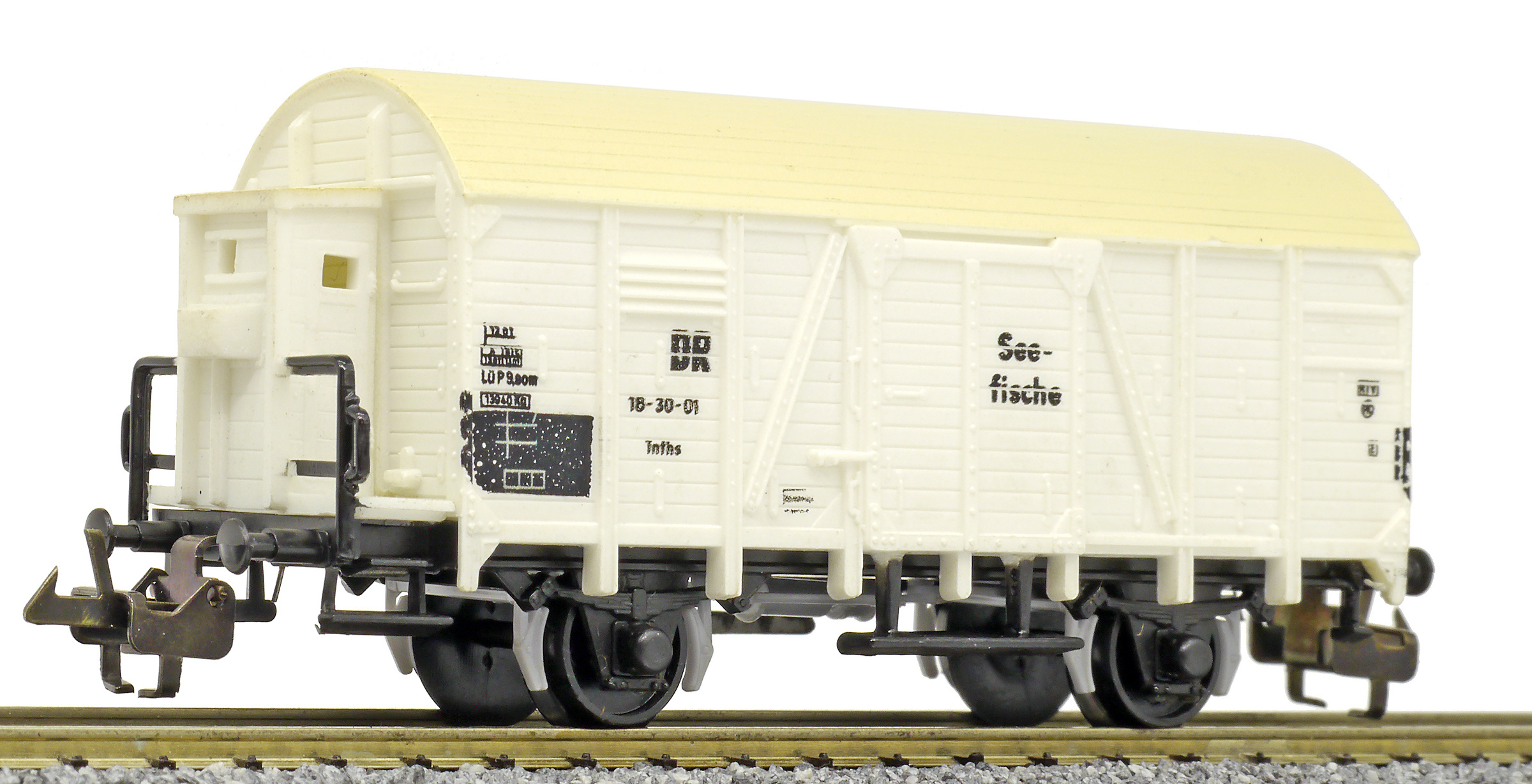 nákladní chladící vůz bílý s krémovou střechou a s brzdařskou budkou na přepravu ryb „Seefische“