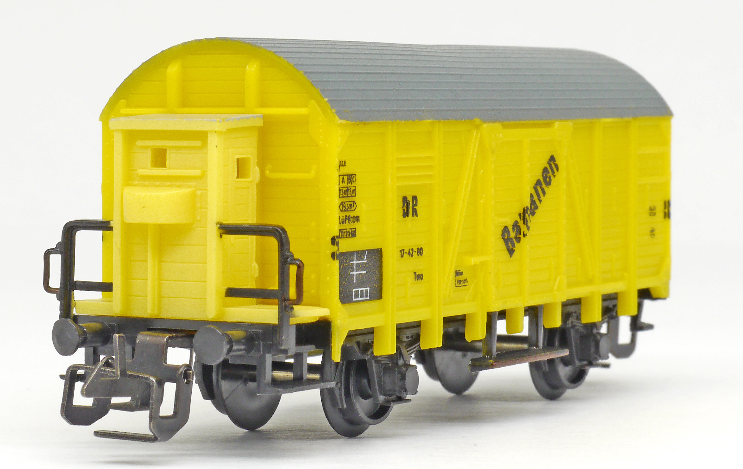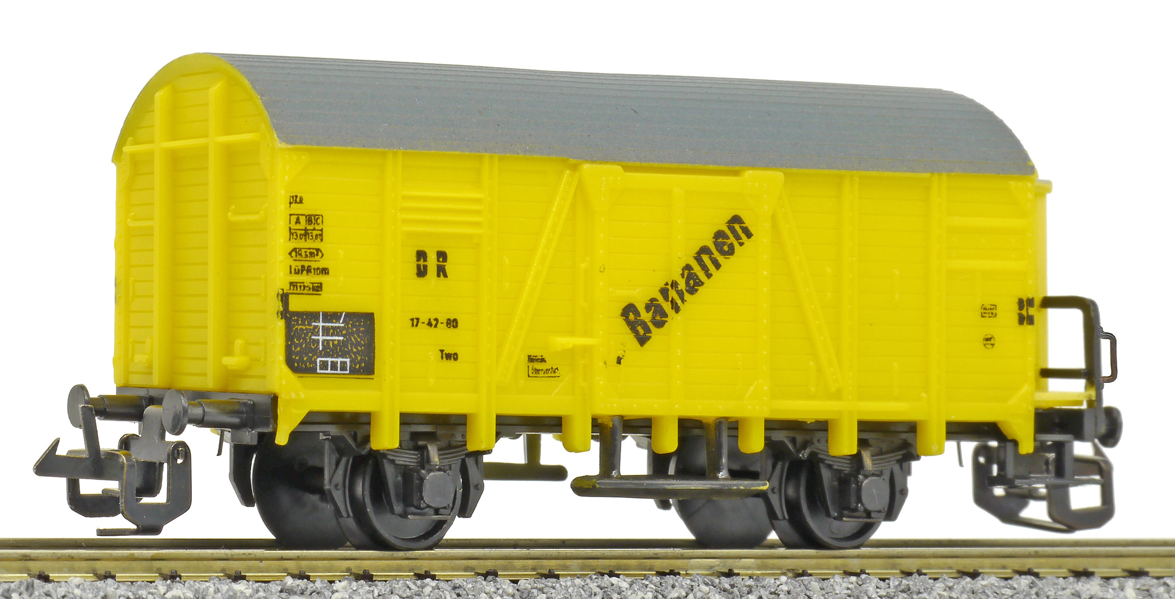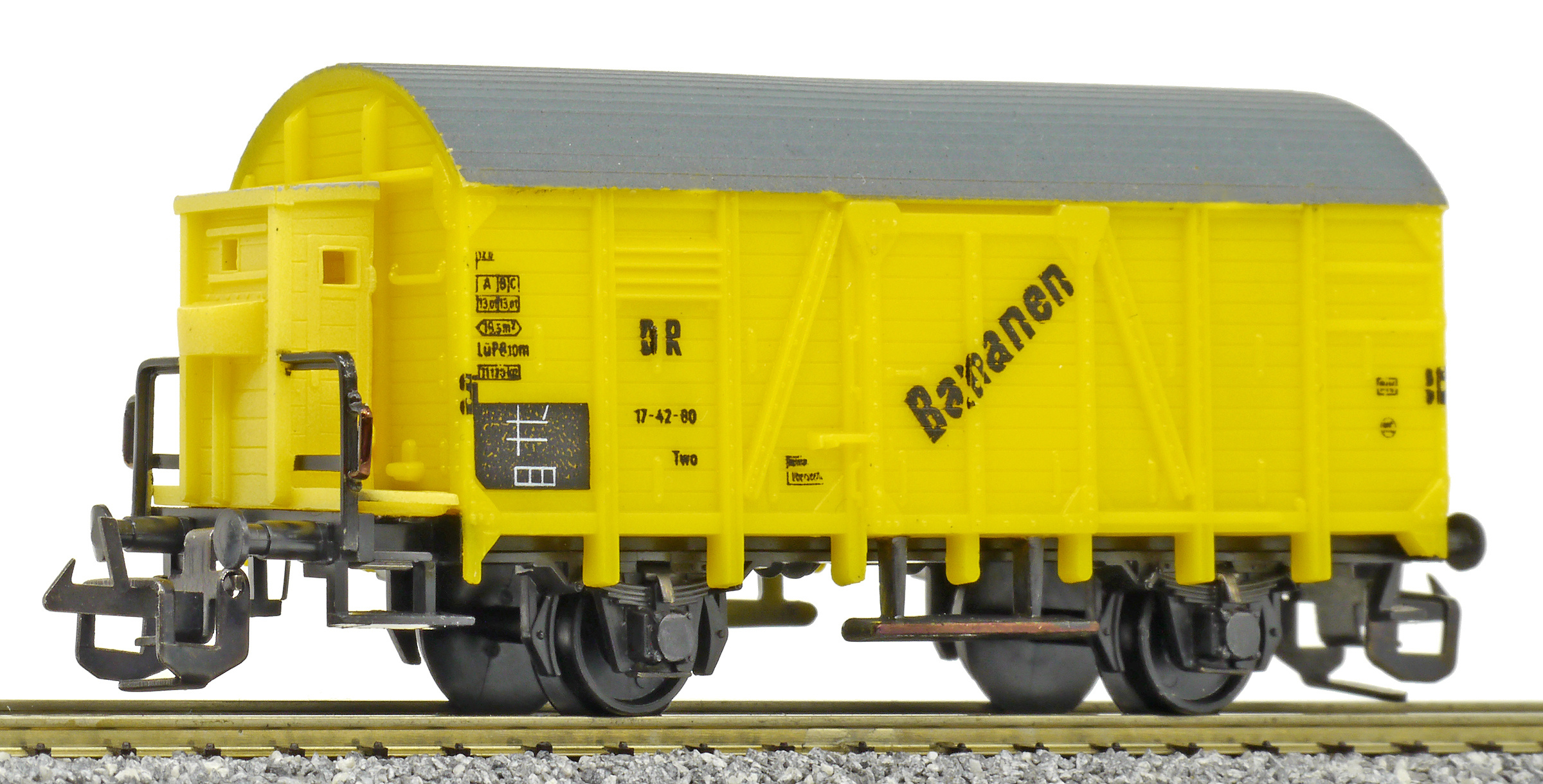 | nákladní vůz žlutý s šedou střechou a s brzdařskou budkou na přepravu banánů „Bananen“ |