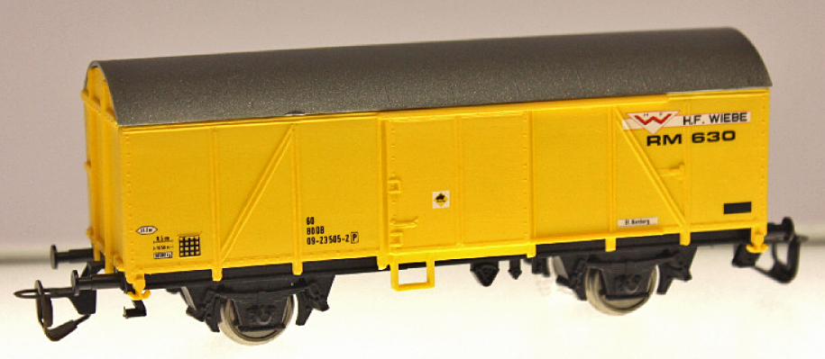 krytý nákladní vůz žlutý s hnědou střechou „H.F. Wiebe“