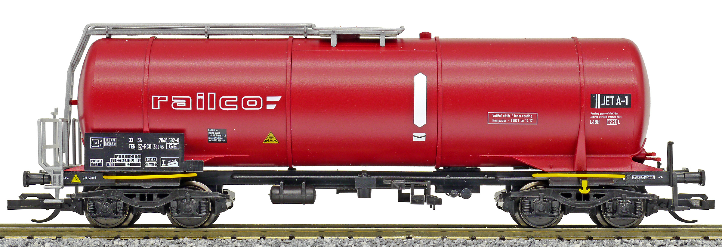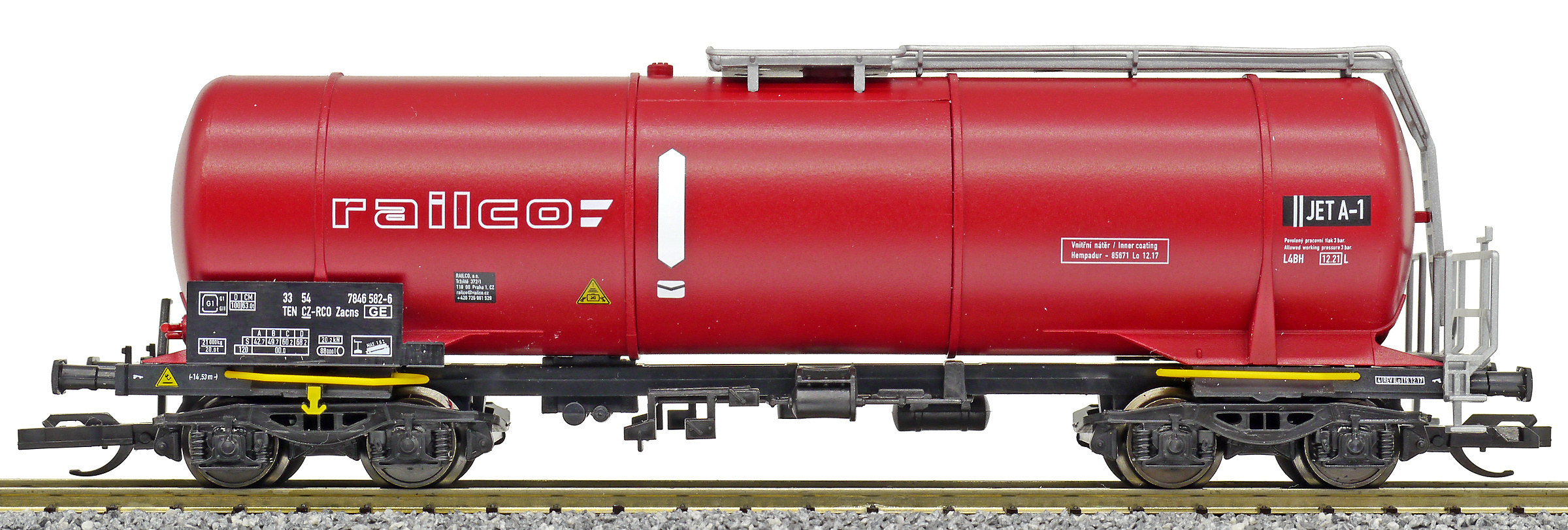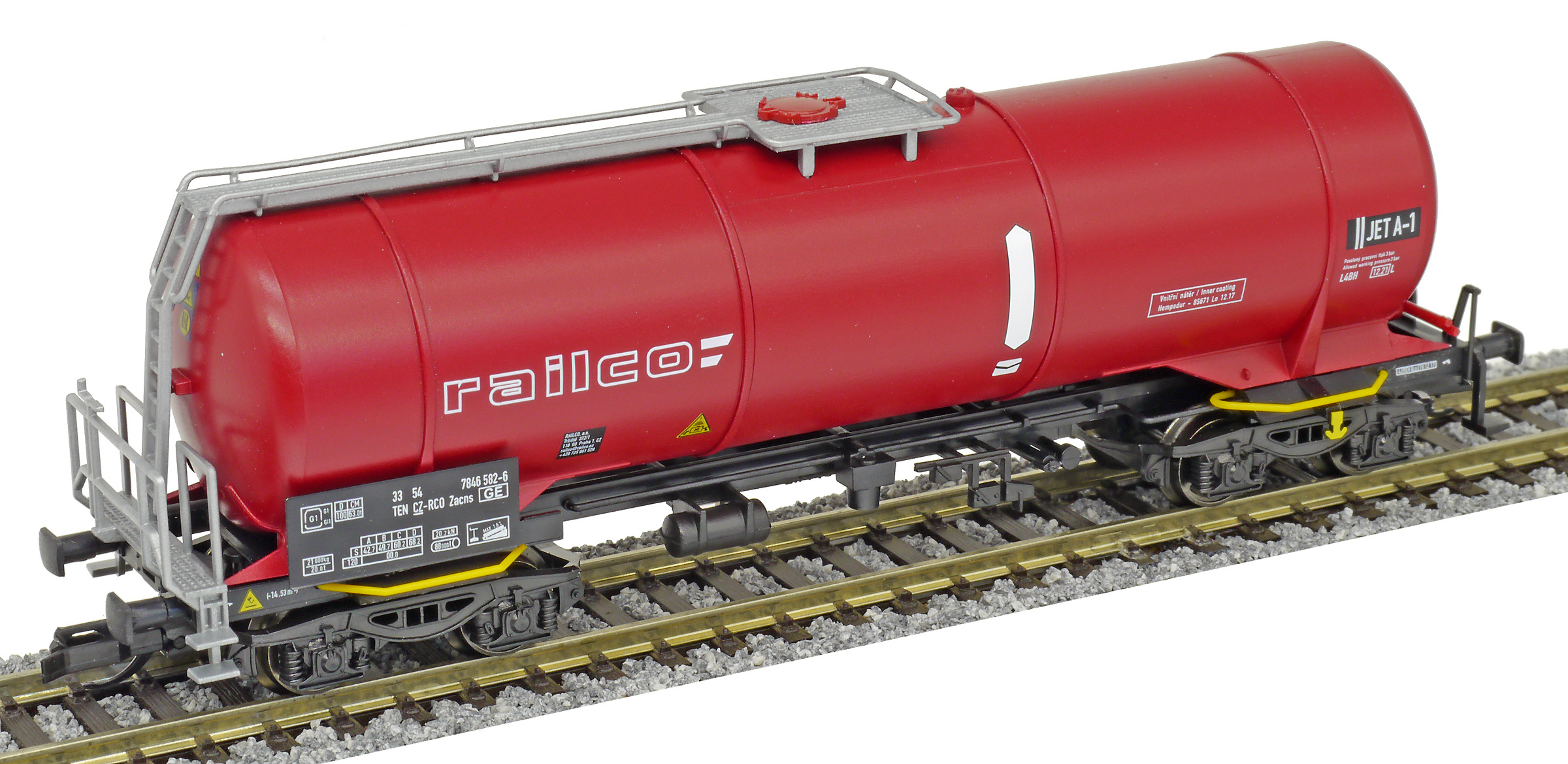 | kotlový vůz tmavě červený s bílými pásy a logem „railco“ |