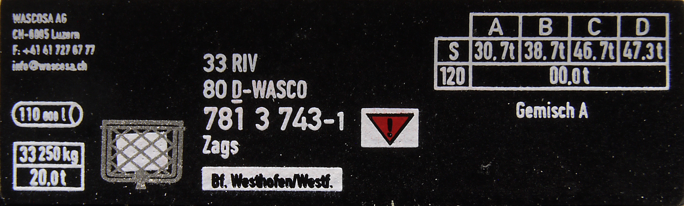| • 33 80 781 3 743-1 | → | nákladní, s podvozky, pevný rozchod, soukromý vůz, RIV, PPV |