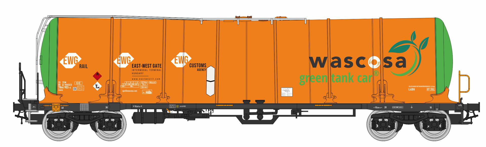 | kotlový vůz oranžový-zelený s logem „wascosa - green tank car“ |