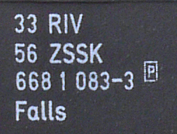 | • 33 56 668 1 083-3 | → | nákladní, s podvozky, pevný rozchod, soukromý vůz, RIV, PPV |
