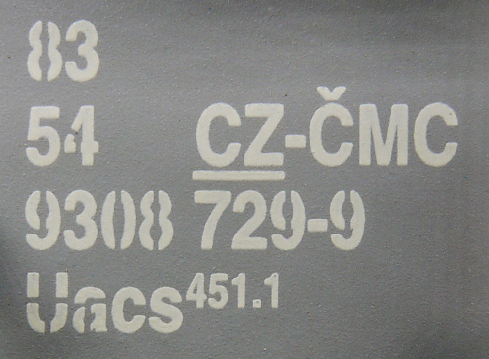 | • 83 54 9308 729-9 | → | nákladní, s podvozky, soukromý vůz, pro mezinárodní dopravu dle zvláštních úmluv |