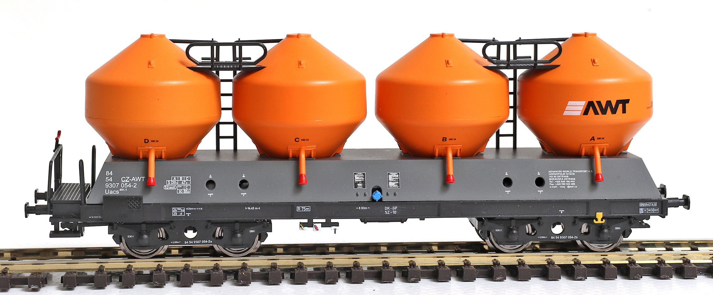 | nákladní samovýsypný vůz černý s oranžovými nádobami „AWT“ |