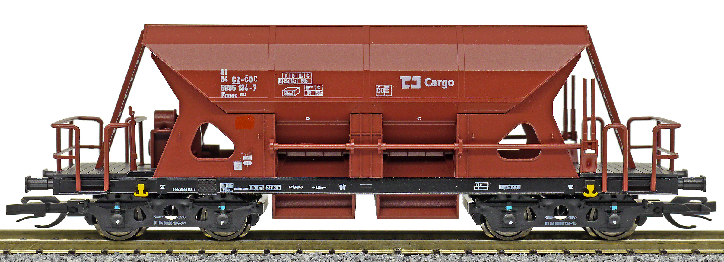Kód   96500012  [Nákladní vozy] → [Samovýsypné] → [4-osé Faccs (Sas)] → 96500012: otevřený samovýsypný vůz červenohnědý „OKD-DOPRAVA“