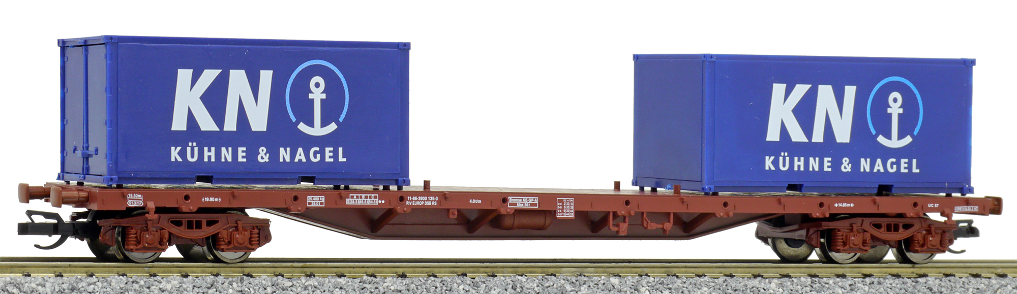 | nákladní plošinový vůz červenohnědý se dvěma kontejnery 20' „Kuhne & Nagel“ |