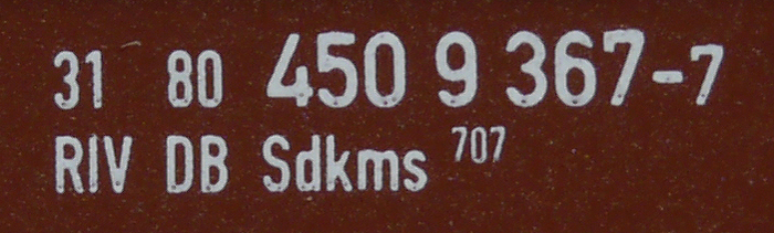 | • 31 80 450 9 367-7 | → | nákladní, s podvozky, pevný rozchod, ve vlastnictví železniční správy, RIV, PPV |