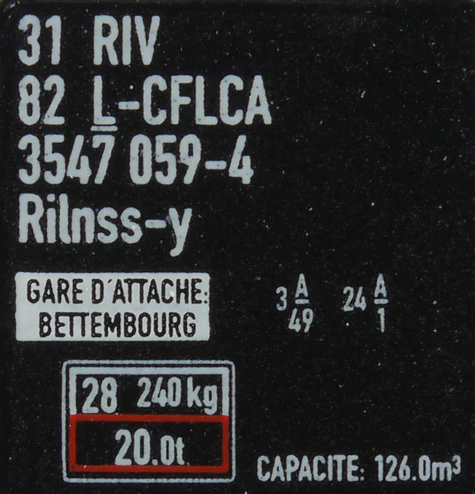 | • 31 82 3547 059-4 | → | nákladní, s podvozky, pevný rozchod, ve vlastnictví železniční správy, RIV, PPV |