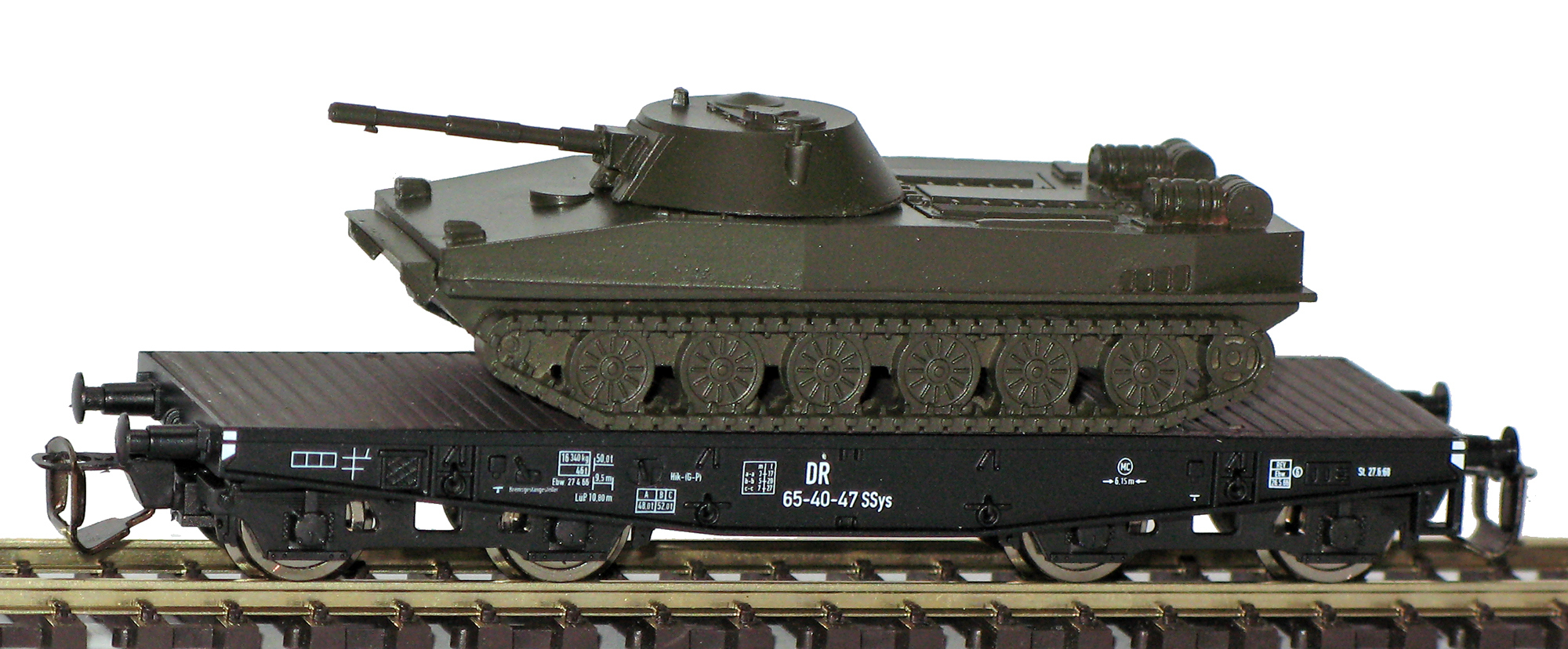 | plošinový nákladní vůz černý ložený tankem PT 76 |