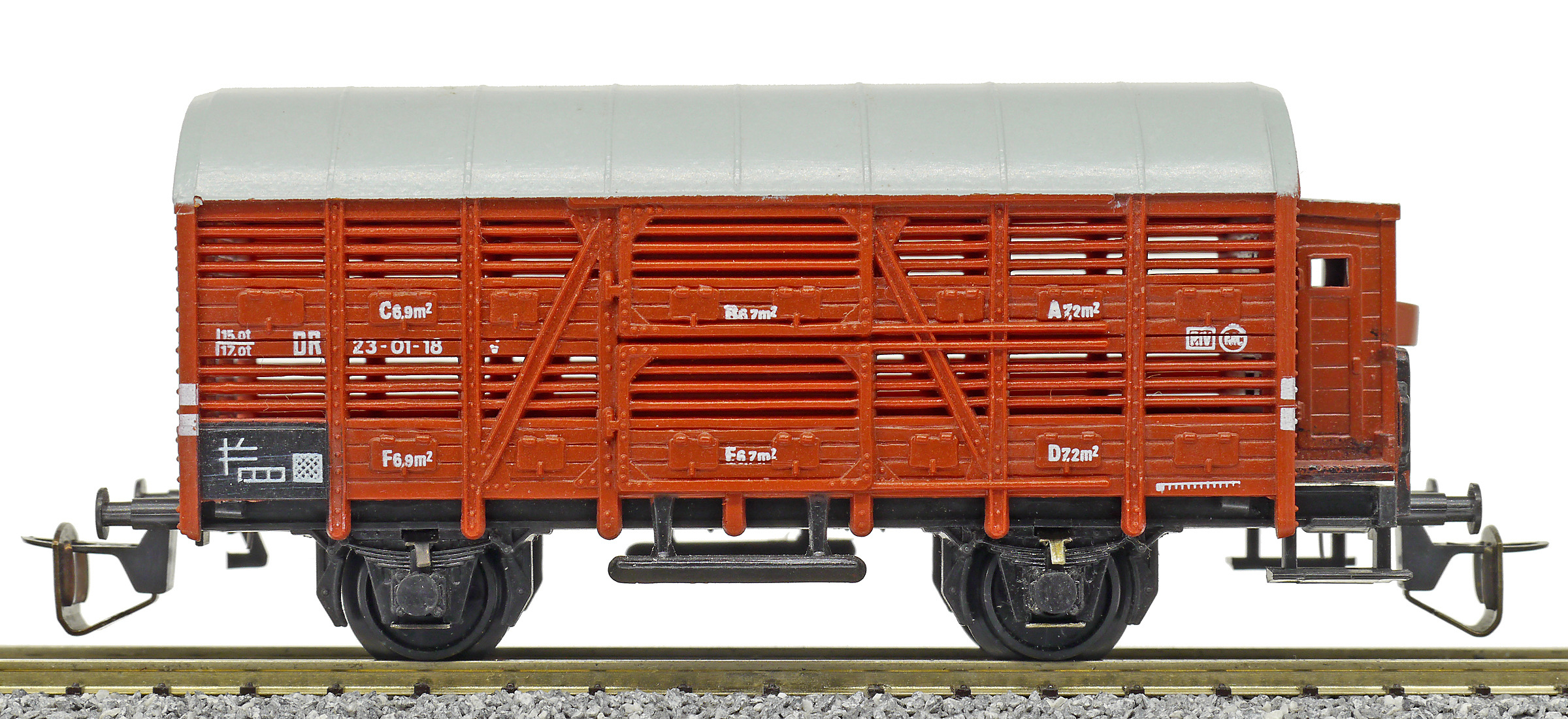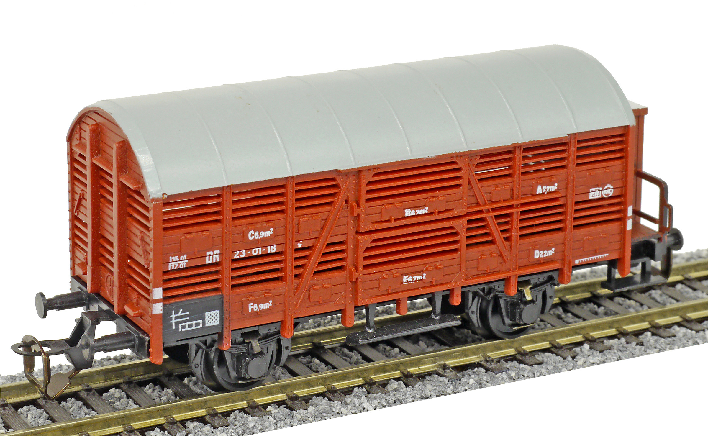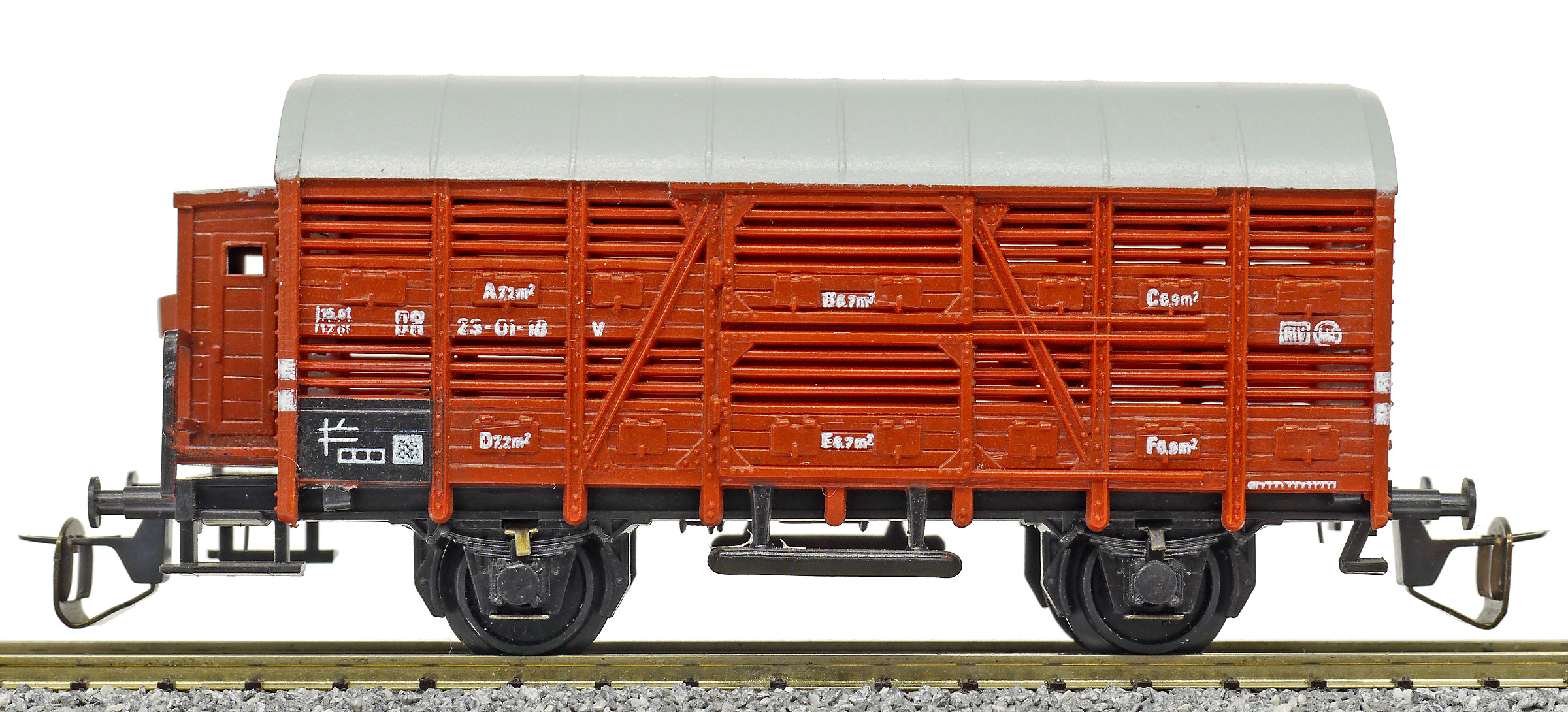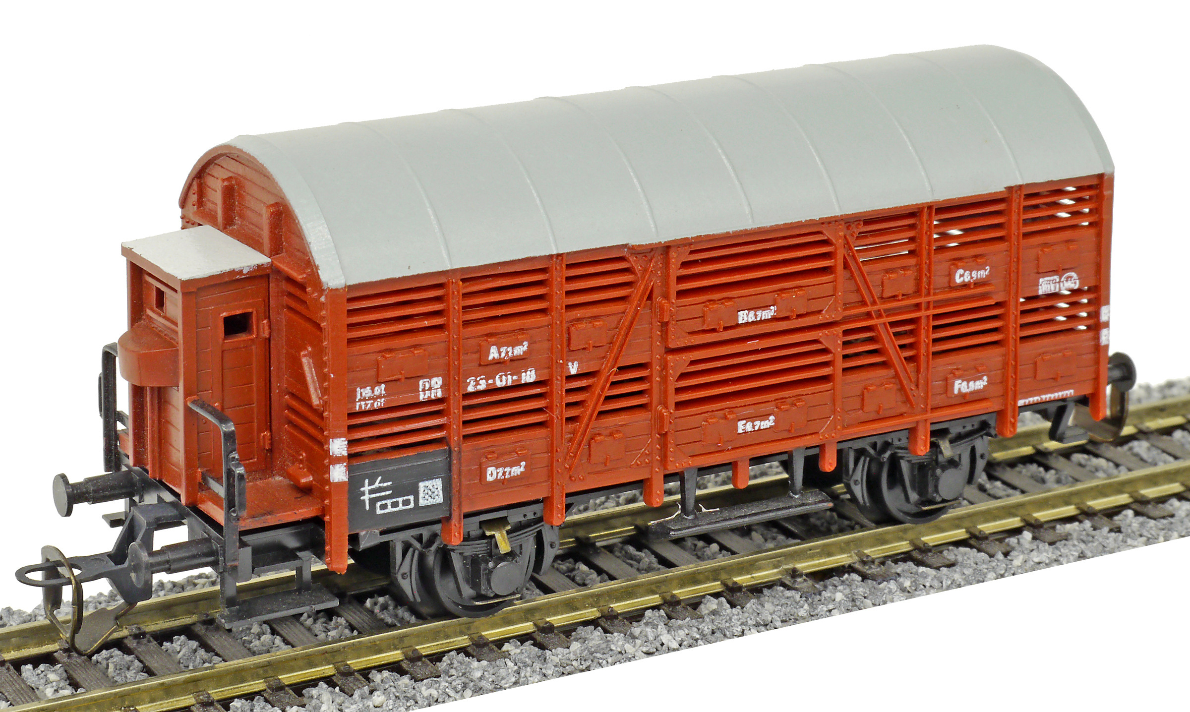 nákladní vůz na přepravu zvířat červenohnědý s šedou střechou a s brzdařskou budkou