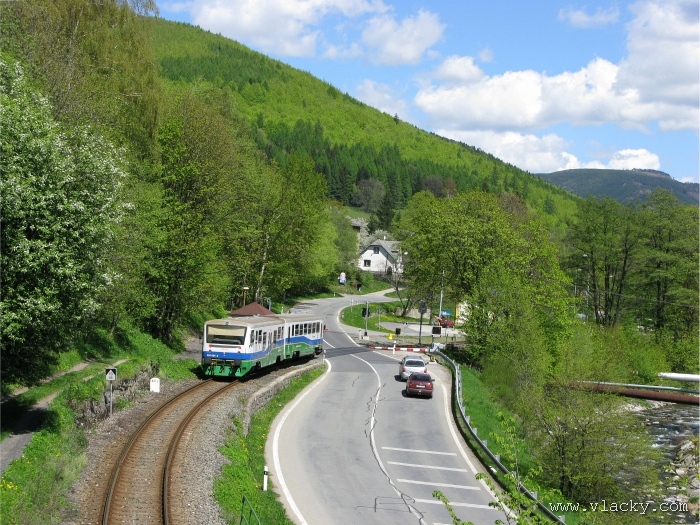 Svoji cestu jsem opět začal u trati mezi Petrovem na Desnou a Sobotínem. Ouha, nestačil jsem stativ připravit a záběr jsem pořídil z ruky. Nevadí, musím si lépe rozložit čas a tento záběr může sloužit jako referenční pro porovnání, jak vypadá takový záběr z ruky, protože následující už budou ze stativu. Přesunul jsem se na další stanoviště. Trať vede z Petrova nad Desnou mezi poli a loukami k mostu přes řeku Desná, následuje zastávka Rapotín zastávka, za ní přejezd se silnicí č. 44 spojující Šumperk s Jeseníkem a hned za ním trať pravotočivým obloukem stoupá k nedaleké zastávce Rapotín. Zde jsem počkal na průjezd Os 13763. Za pár minut za ním jede další Os 13765 z Velkých Losin do Šumperka. Na ten jsem si počkal na nástupišti nedaleké zastávky Rapotín v 11.16. Popojel jsem dále až za zastávku Loučná nad Desnou. Zde trať levotočivým obloukem hned dvakrát přetíná místní komunikaci se zabezpečenými přejezdy. Po průjezdu Os 13764 jsem stačil jsem dojet do následující zastávky Loučná nad Desnou-Rejhotice. Motorová jednotka Desná se již vracela z Koutů nad Desnou zpět jako Os 13767. Pokračoval jsem dále až na konečnou do Koutů nad Desnou, kde jsem si dopřál polední pauzu u kávy. Před vjezdem do stanice Kouty nad Desnou je opěrná zeď a nad ní vedoucí polní cesta. Odtud je hezký rozhled na vjezd do stanice Kouty nad Desnou. Samotná stanice je však bohužel skryta za stromořadím u řeky Desná. Počkal jsem na příjezd Os 13766 v 13.47 a potom jsem spěchal dále. Měl jsem vyhlédnuto další místo poblíž zastávky Loučná nad Desnou-Rejhotice. Souprava Desná se již vracela v 14.13 jako Os 13771. Na zastávce Loučná nad Desnou-Rejhotice jsem pořídil několik záběrů. Proti loňskému roku byla vlečková kolej definitivně snesena, zbytek zůstal pouze na přejezdu v místní komunikaci a za branou areálu. Další krátká zastávka byla v Loučné nad Desnou. Původní staniční budova byla ve srovnání s loňským rokem spravena a opatřena novou fasádou. Na další Os 13770 jsem počkal u přejezdu před Loučnou nad Desnou v 15.20. Jak jsem se dozvěděl později, motorový vůz pro neschopnost již dále nedojel a tato technická závada tak způsobila zpoždění i dalších vlaků. Postižen byl hned Os 13772, který jsem zastihl při zpáteční cestě na zastávce Rapotín zastávka. Vrátil jsem se zpět do Petrova nad Desnou. Os 23867 ze Sobotína nedojel, byl nahrazen autobusem. Os 13773 přijížděl do Petrova nad Desnou také se zpožděním. Protože na obrat v Šuumperku je jen 8 minut, zpožděn byl i Os 13774, na který jsem čekal v polích u vjezdového návěstidla do Petrova nad Desnou, a následující Os 13775 z Koutů nad Desnou, který v Petrově nad Desnou musel počkat na vracející se přípoj od Sobotína. Ale den ještě neskončil. Vrátil jsem se do stanice Petrov nad Desnou kolem 20. hodiny, abych zkusil ještě noční focení. Po západu slunce měnila obloha postupně svoji barvu z nevýrazných odstínů krátce po soumraku, přes krásně temně modrou až po neproniknutelnou černou. Dá se říci, že krásně temně modrá obloha pro focení vydrží tak půlhodinku. Pochopitelně na stativ jsem upevnil fotoaparát, protože expoziční časy se postupně prodlužovaly od 5s až do 15s. Na noční akce by se hodily tak stativy dva, druhý pro kameru. Poslední záběr jsem už nestačil exponovat a z odjíždějícího Os 13782 zůstaly jen obrysy a stopy po reflektorech.
